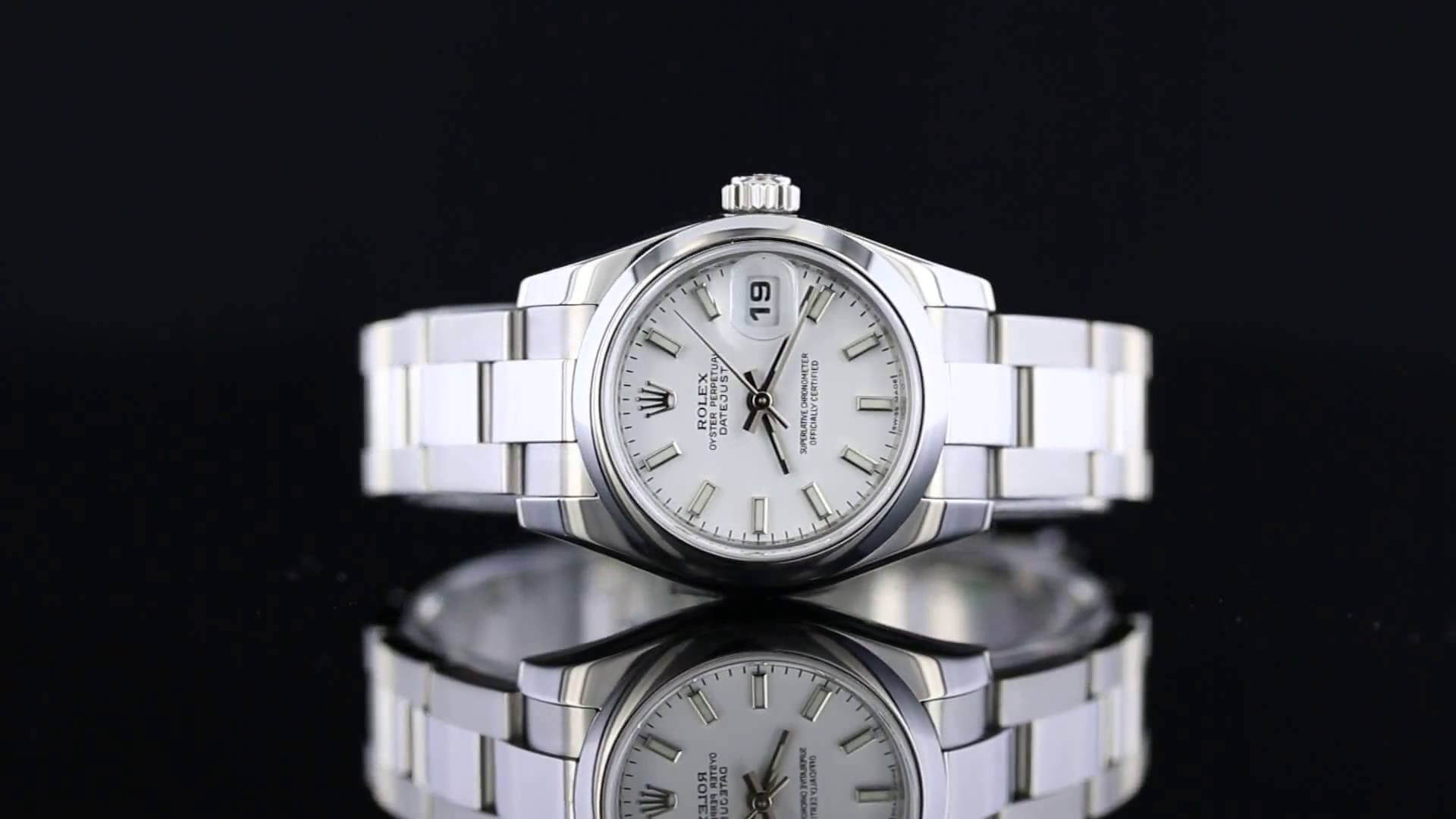 • רולקס דייטג'אסט נשים 26 מ"מ: פלדה עם בייזל זהב לבן 18 קרט. מיוצר עם ספרות רומיות וצמיד ג'ובילה.