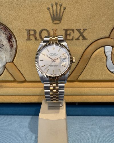 רולקס דייטג'אסט 36מ"מ אספנות במצב נדיר!! פלדה משולב זהב צהוב 18 קראט וינטג' יד שנייה-1987 לוח סילבר כסוף מצב נדיר עם תעודה מקורית דגם.16013