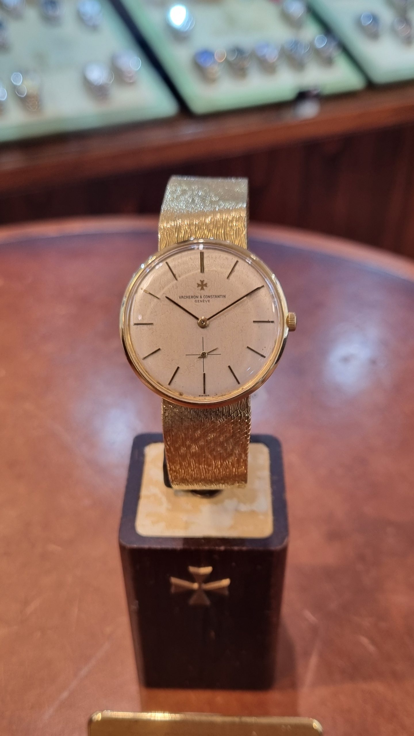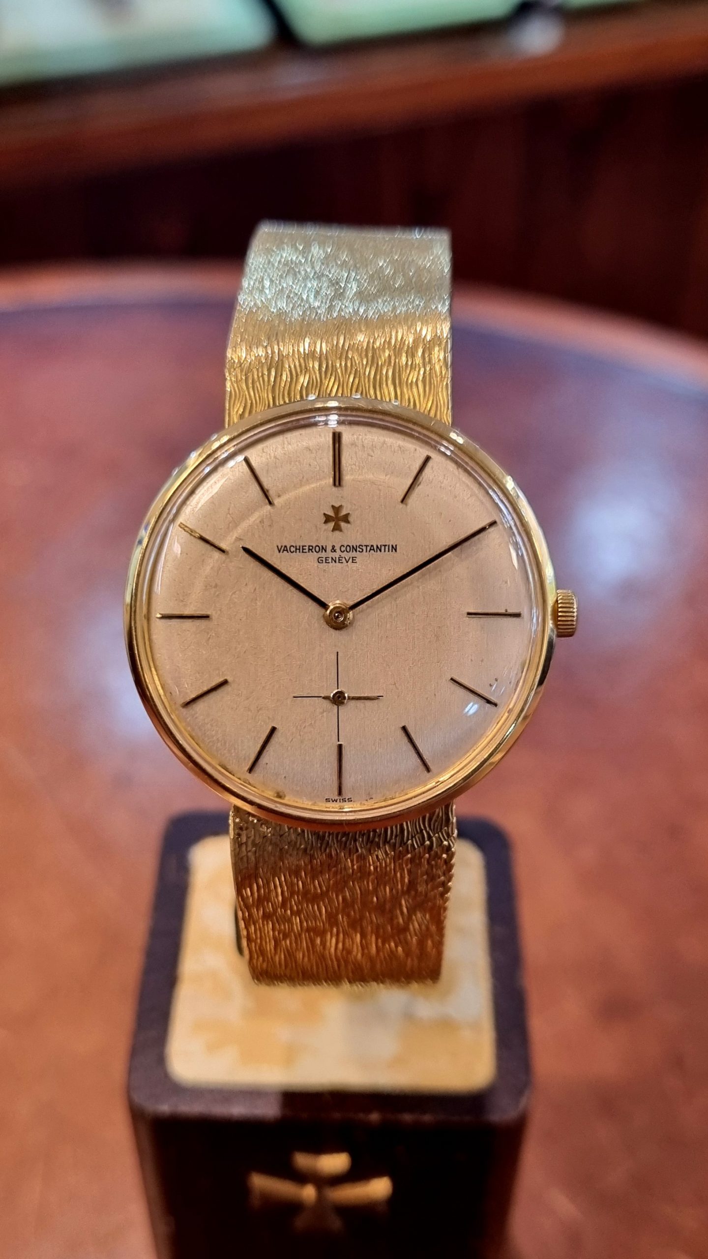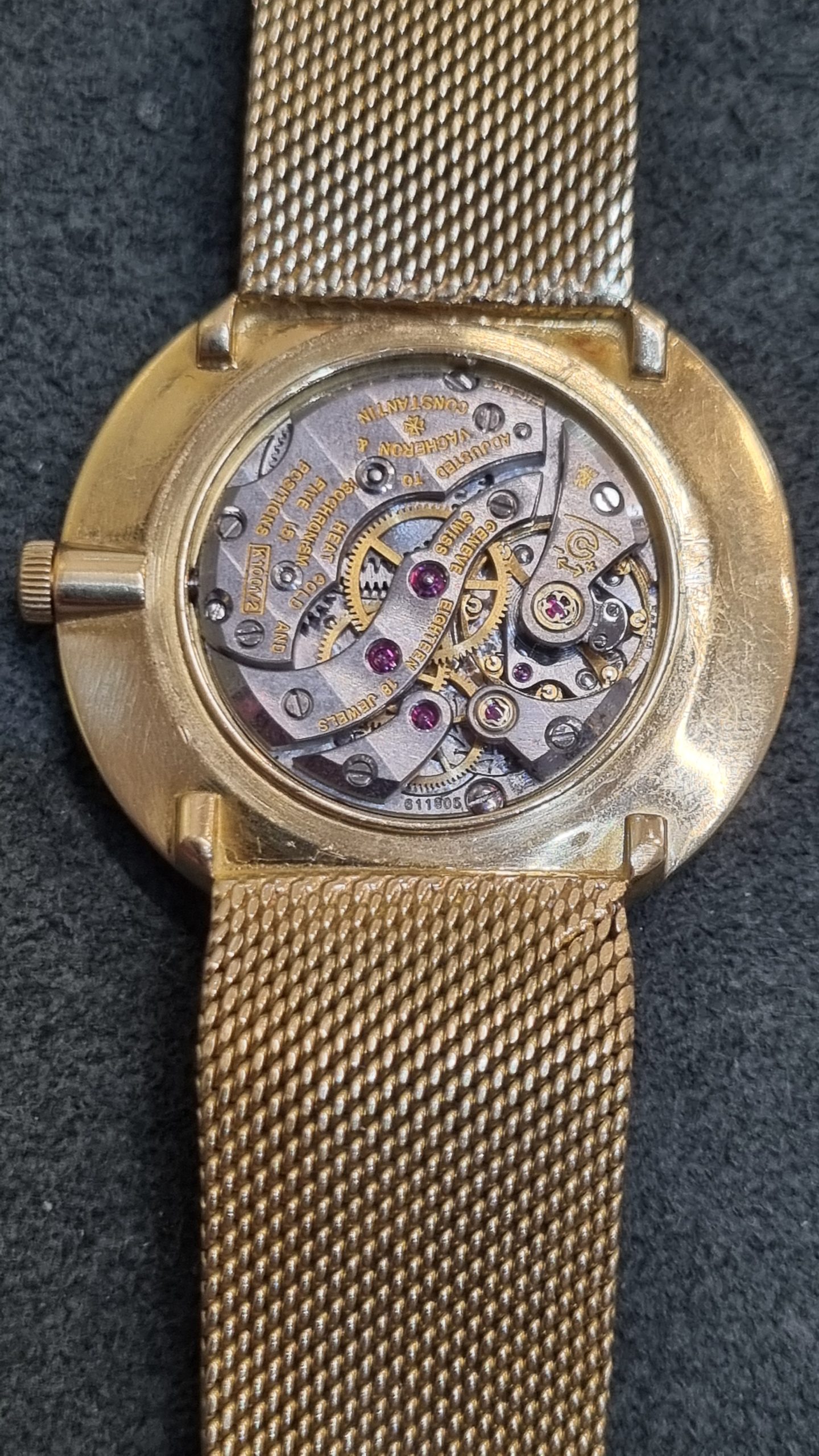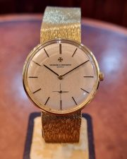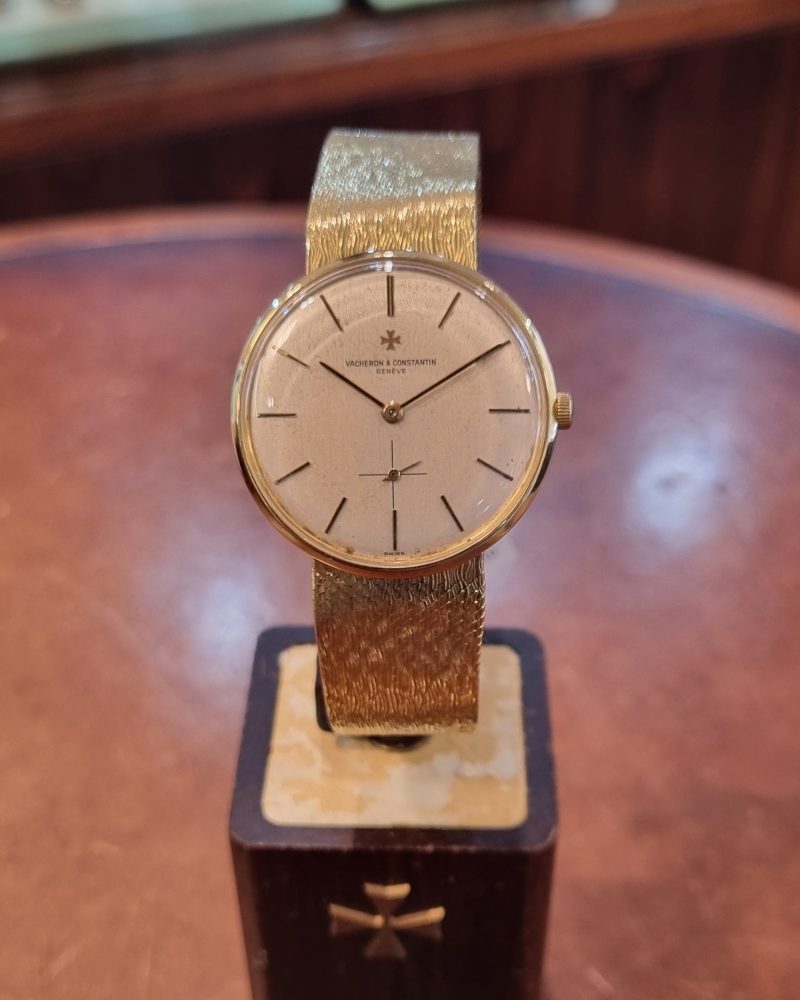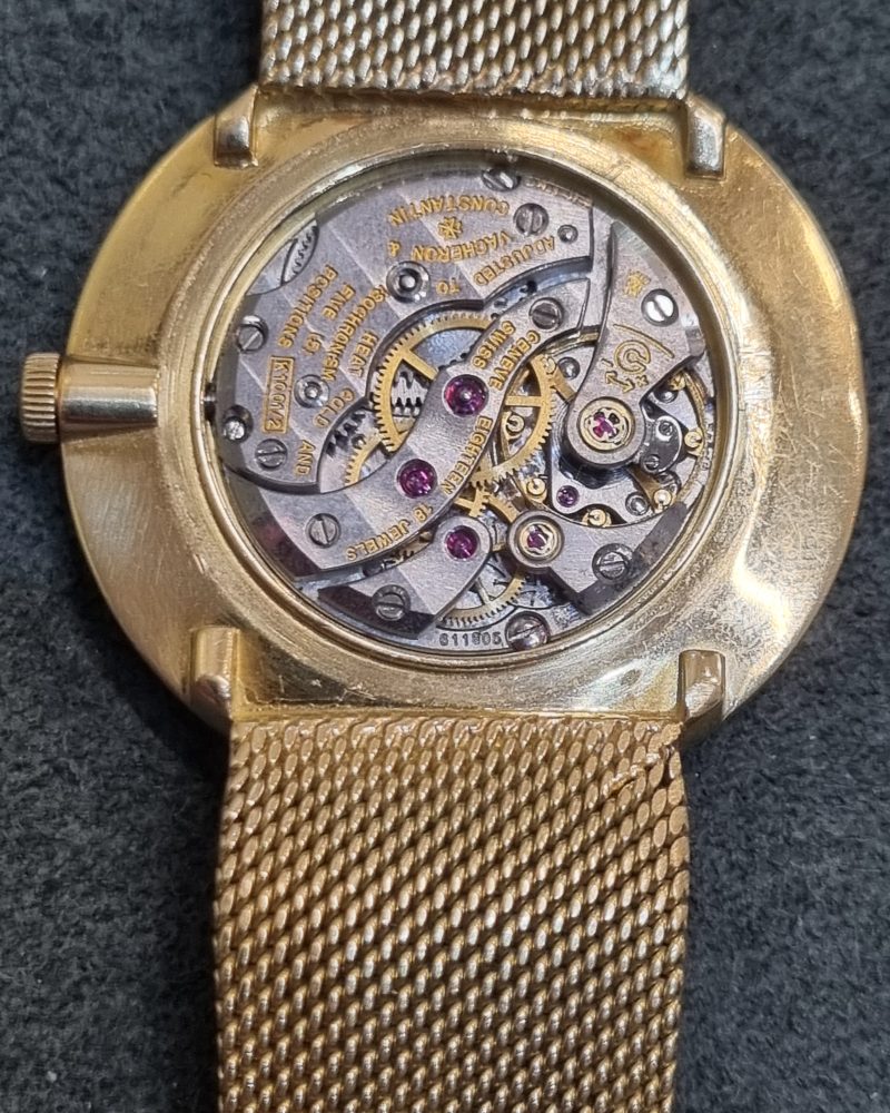 ושרון קונסטנטין וינטג' זהב צהוב 18 קראט שנות ה-60 מנגנון ושרון מתיחה ידנית, קליבר אחד המנגנונים הטובים שיוצרו 1001, דגם.6319, צמיד זהב אינטגרלי עם לוגו ושרון בסוגר, 33ממ קלסי