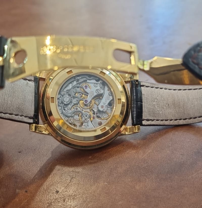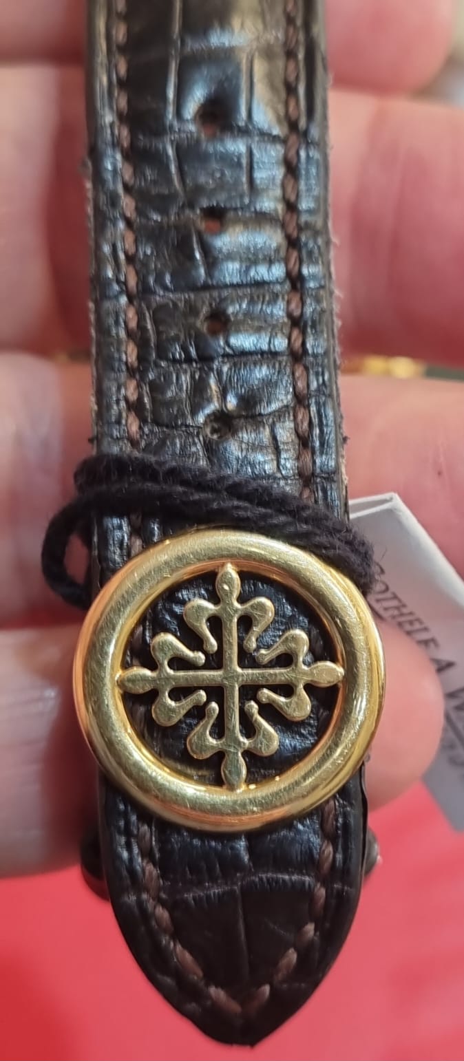 יד שנייה 1998-2008. פאטק פיליפ 5070J זהב צהוב 18 קראט עם מנגנון מתיחה ידנית. 42ממ, רצועת עור קרוקו וסוגר פטנט לוגו פאטק פיליפ.