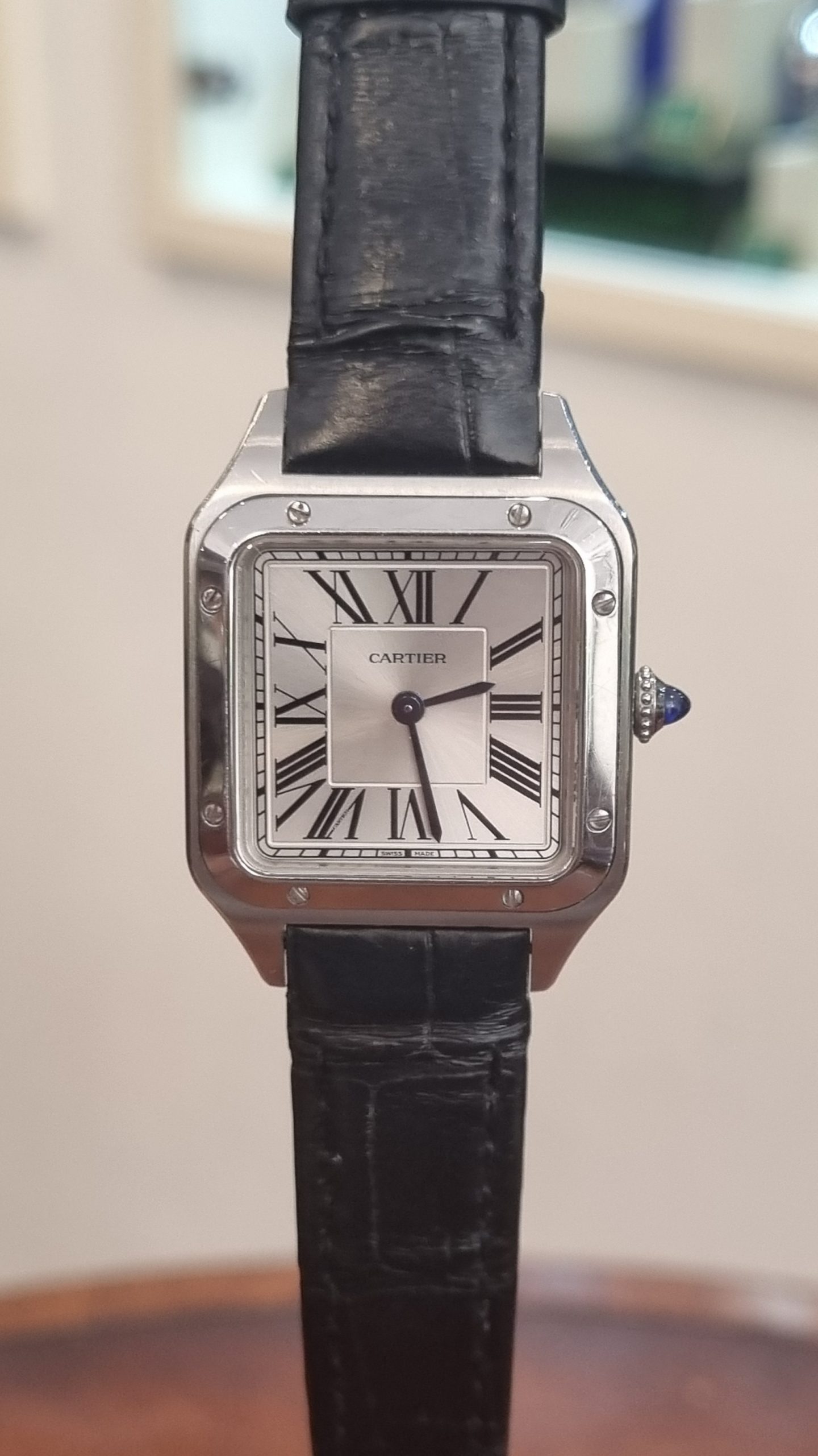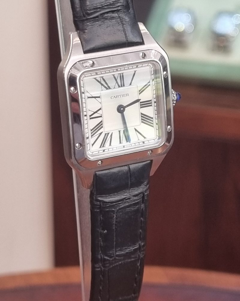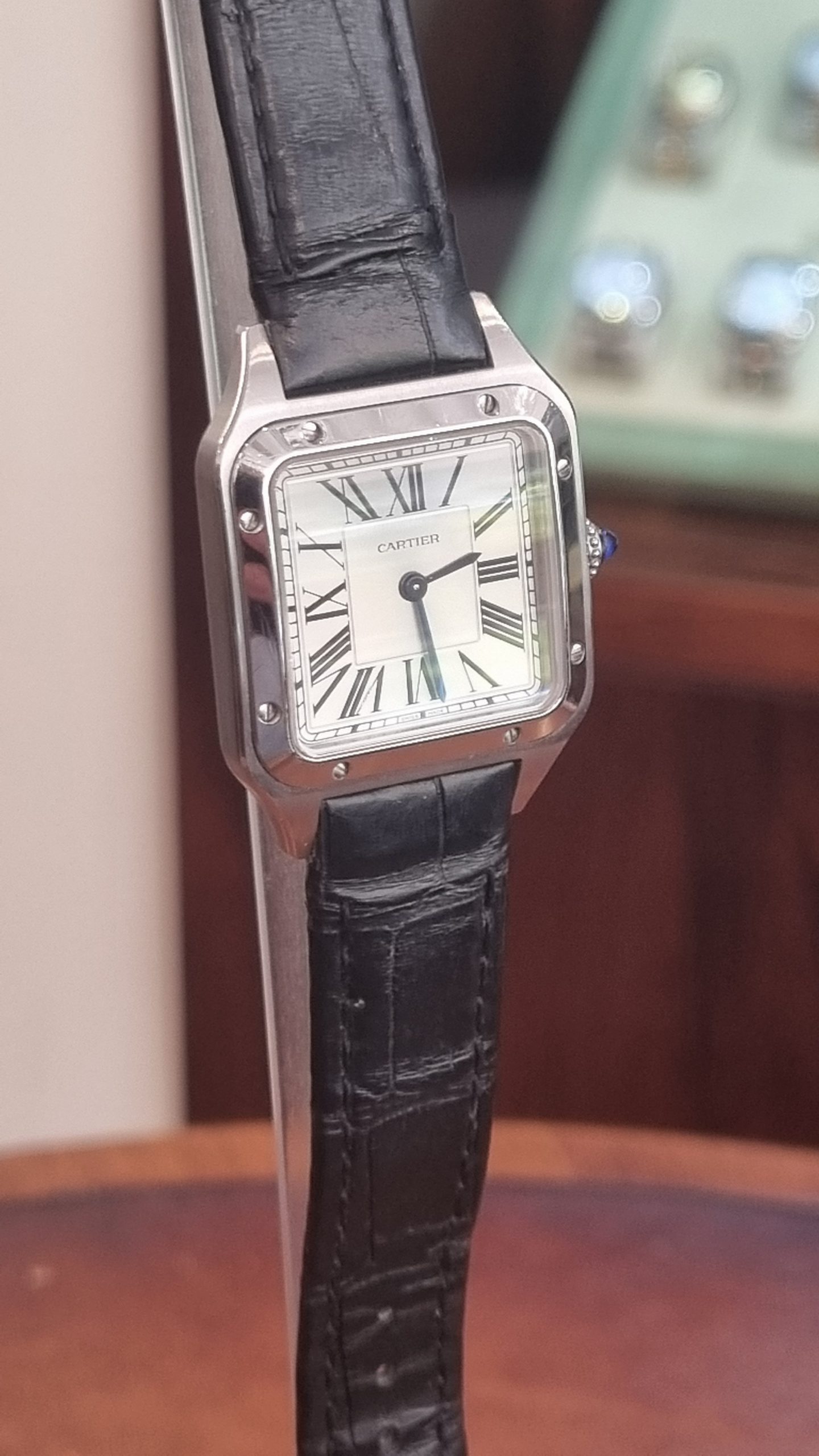 קרטייה סנטוס דומונט נשים יד שנייה שנת 2024, מידה סמול-דגם.wssa0023, רצועת עור קרוק שחורה מקורית.