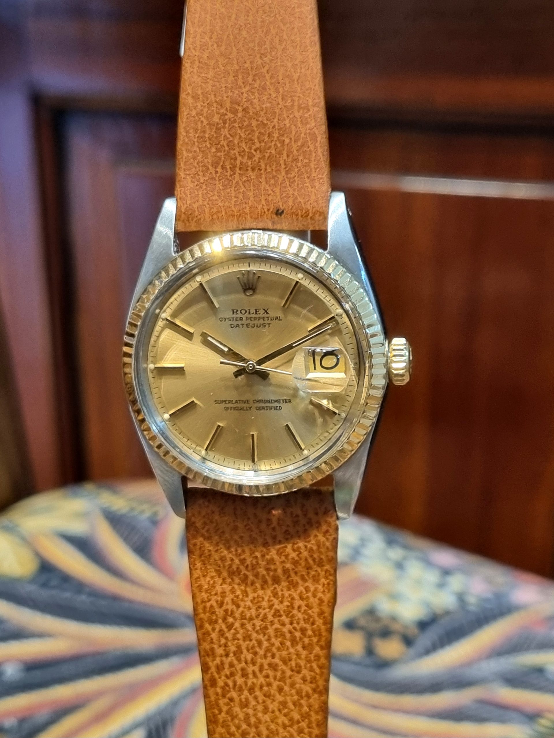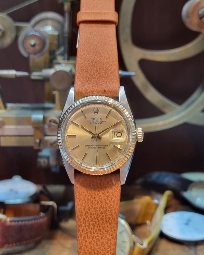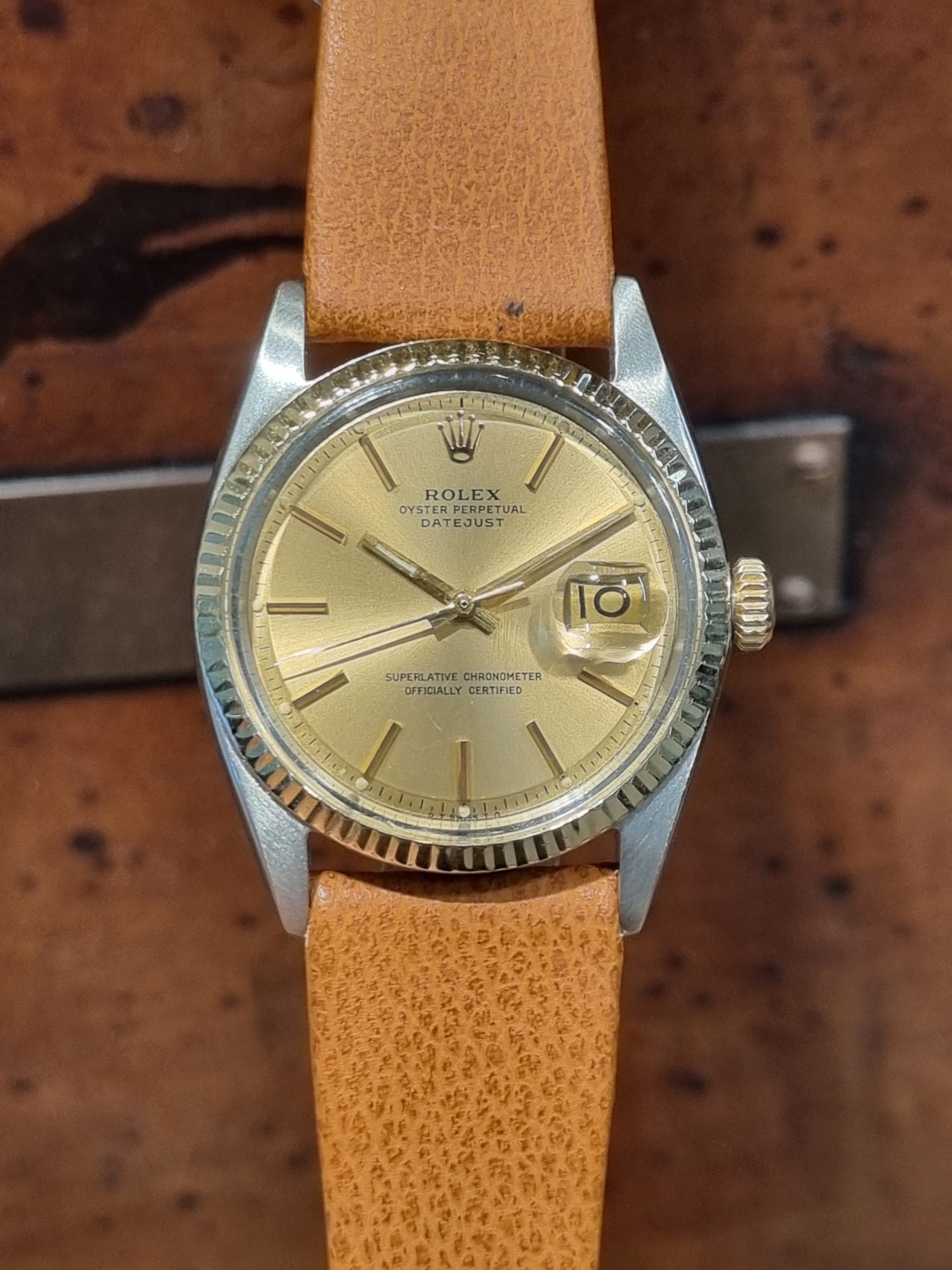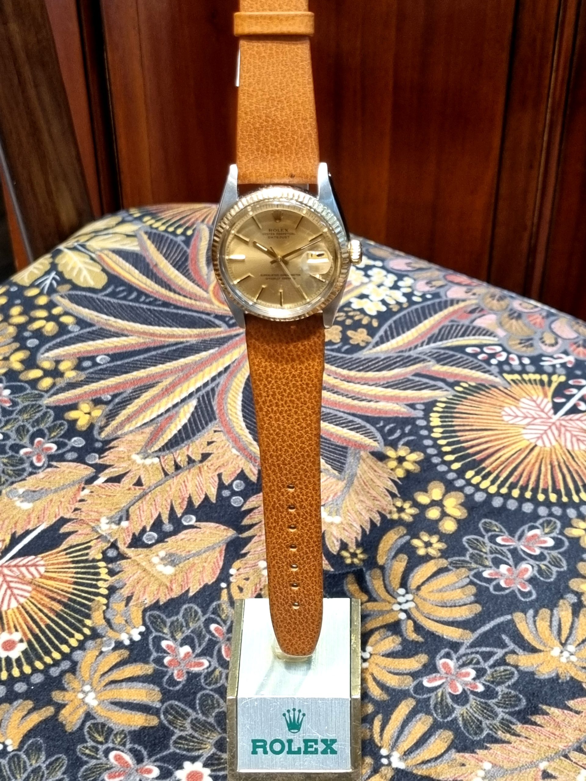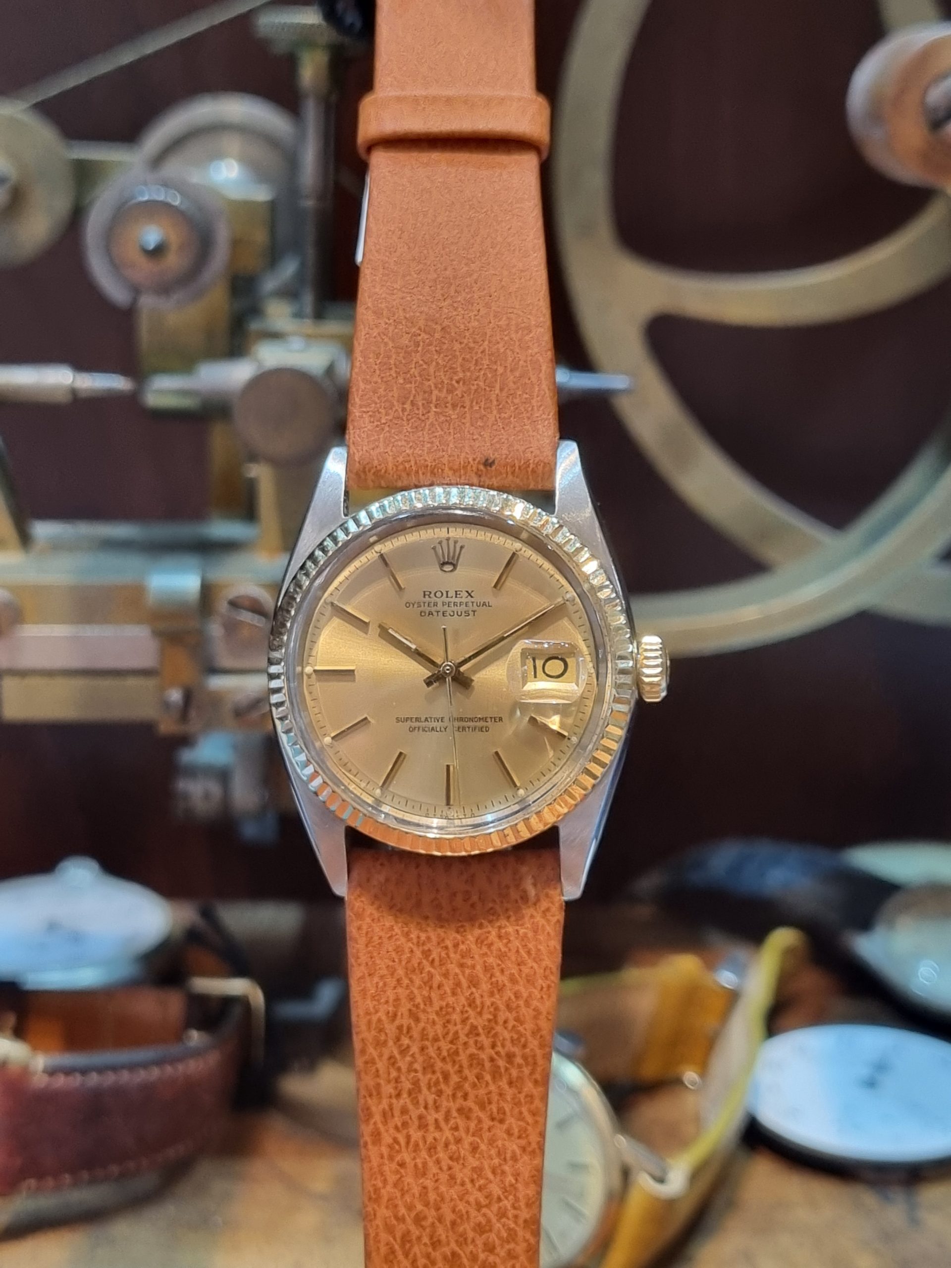 רולקס דייטג'אסט וינטג' דגם.1601 לוח "פאי פן" שמפניה 36 מ"מ, על רצועת עור, שנות ה-60