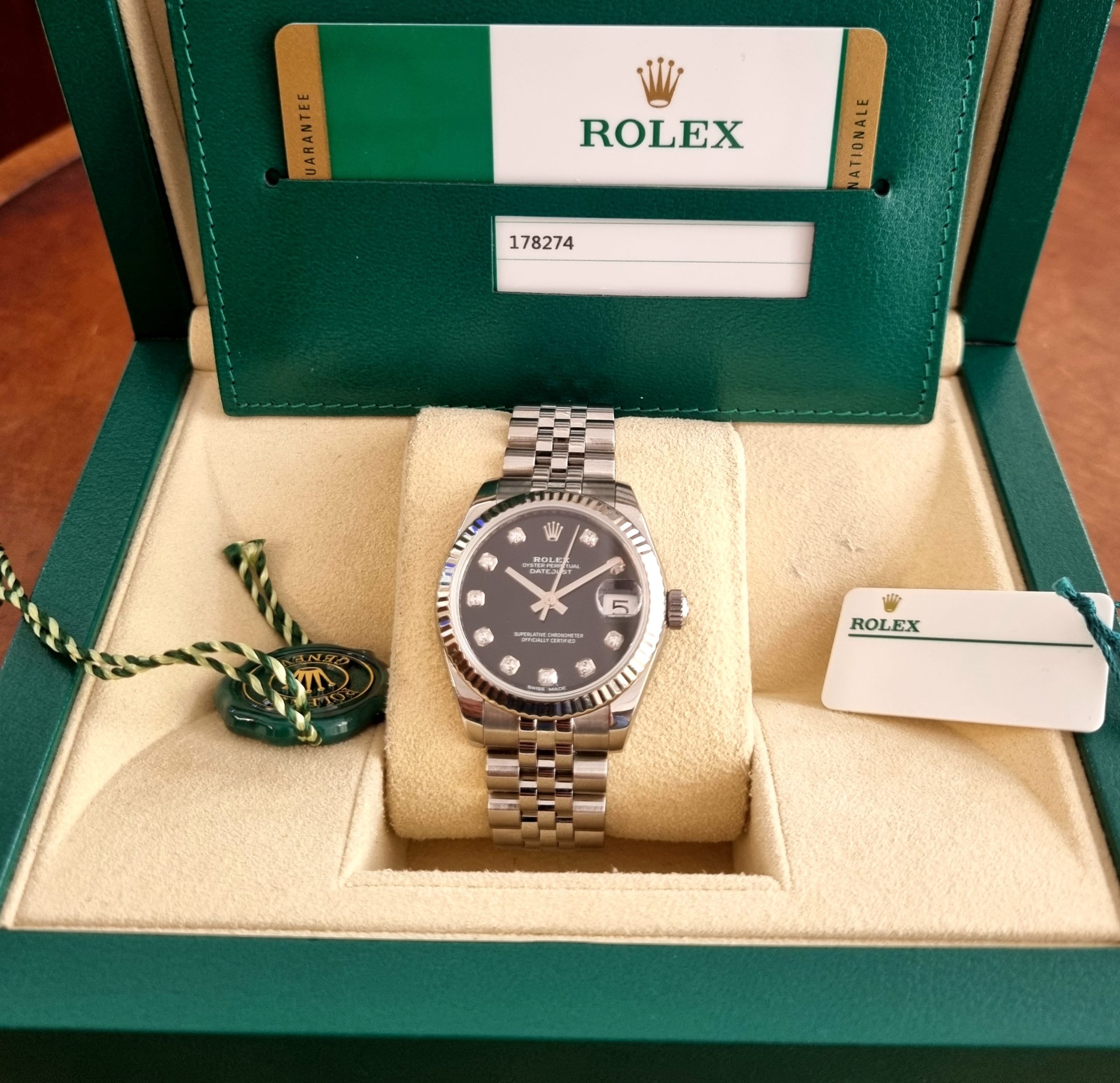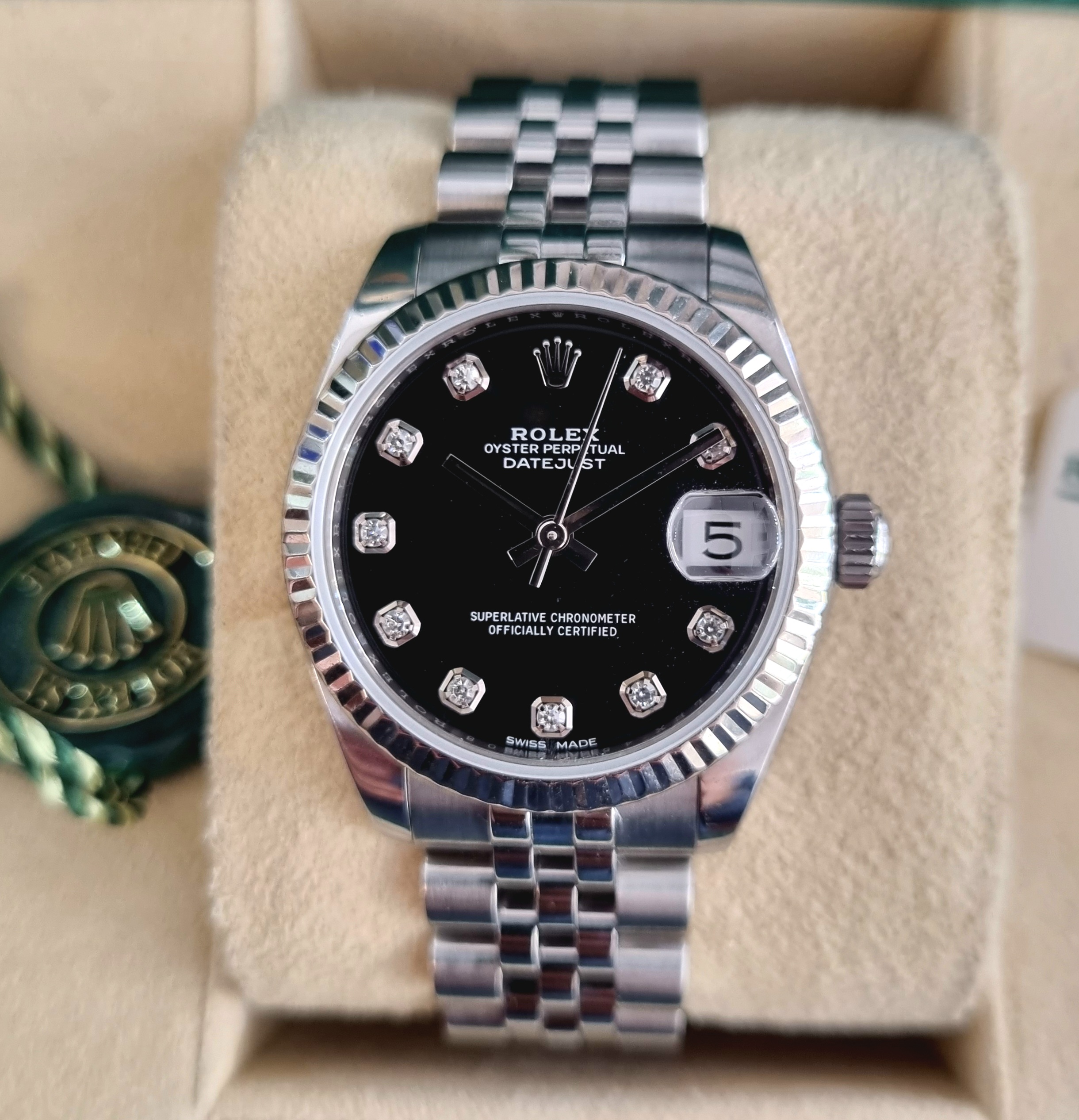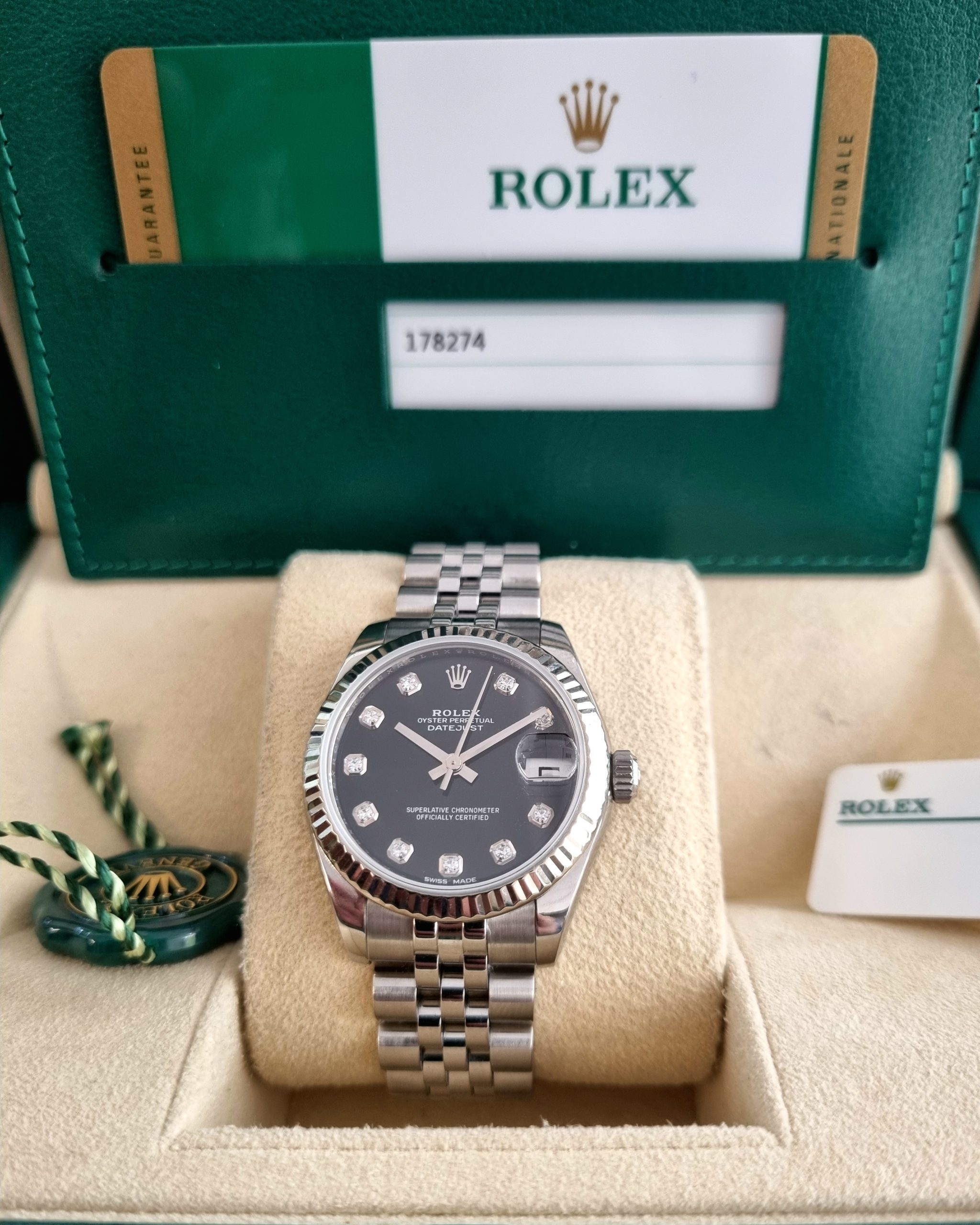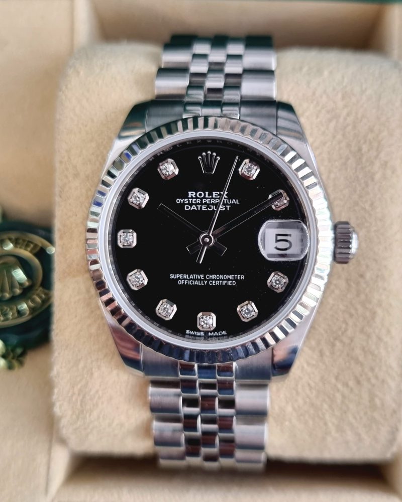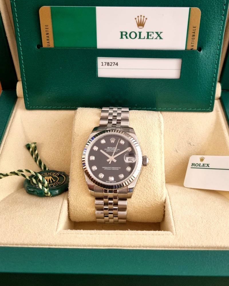 רולקס דייטגאסט 31ממ נשים אויסטר פלדה עם בזל זהב לבן, צמיד ג'ובילי, לוח שחור יהלומים, יד שנייה שנת 2015, דגם.178274