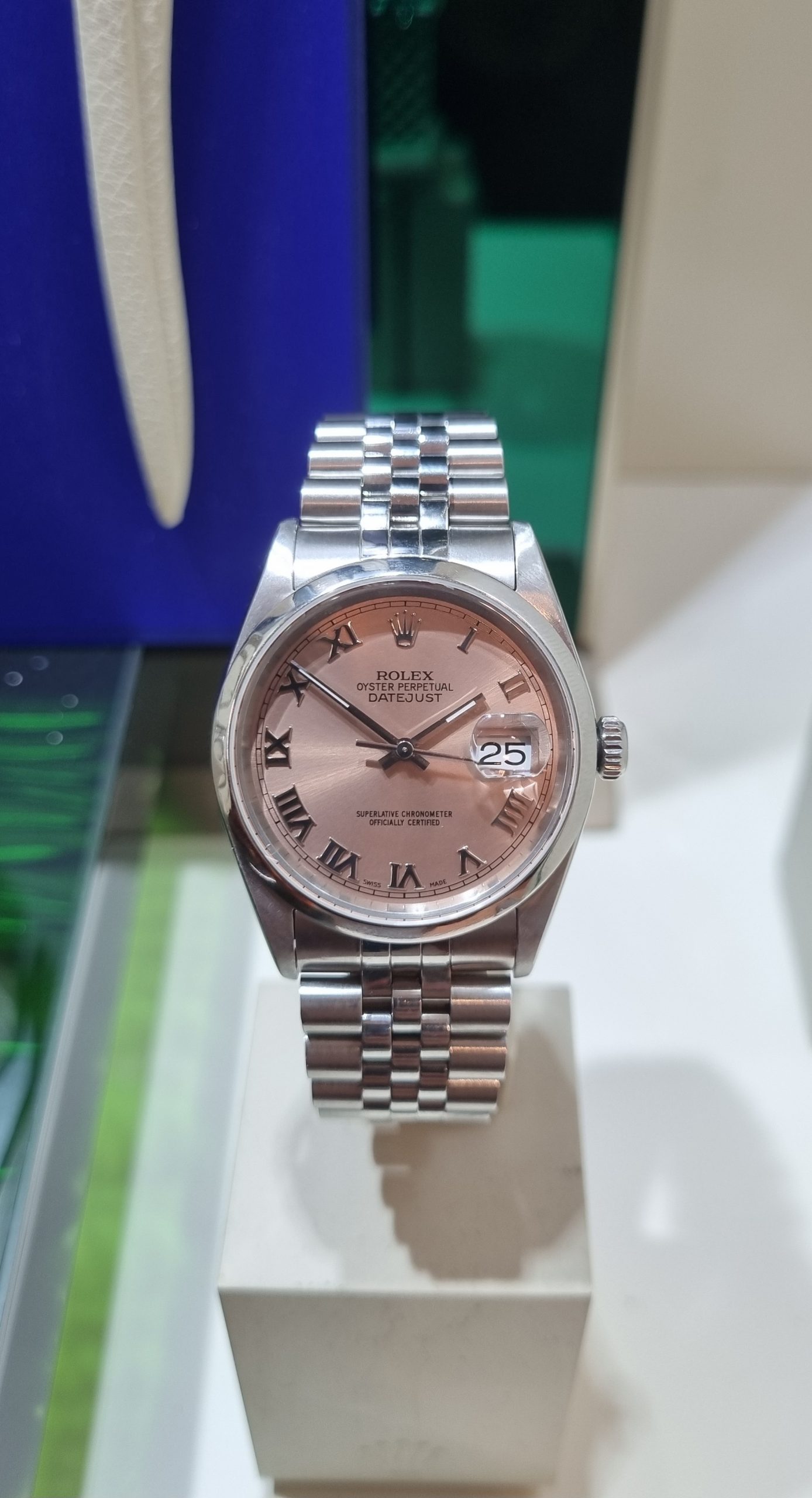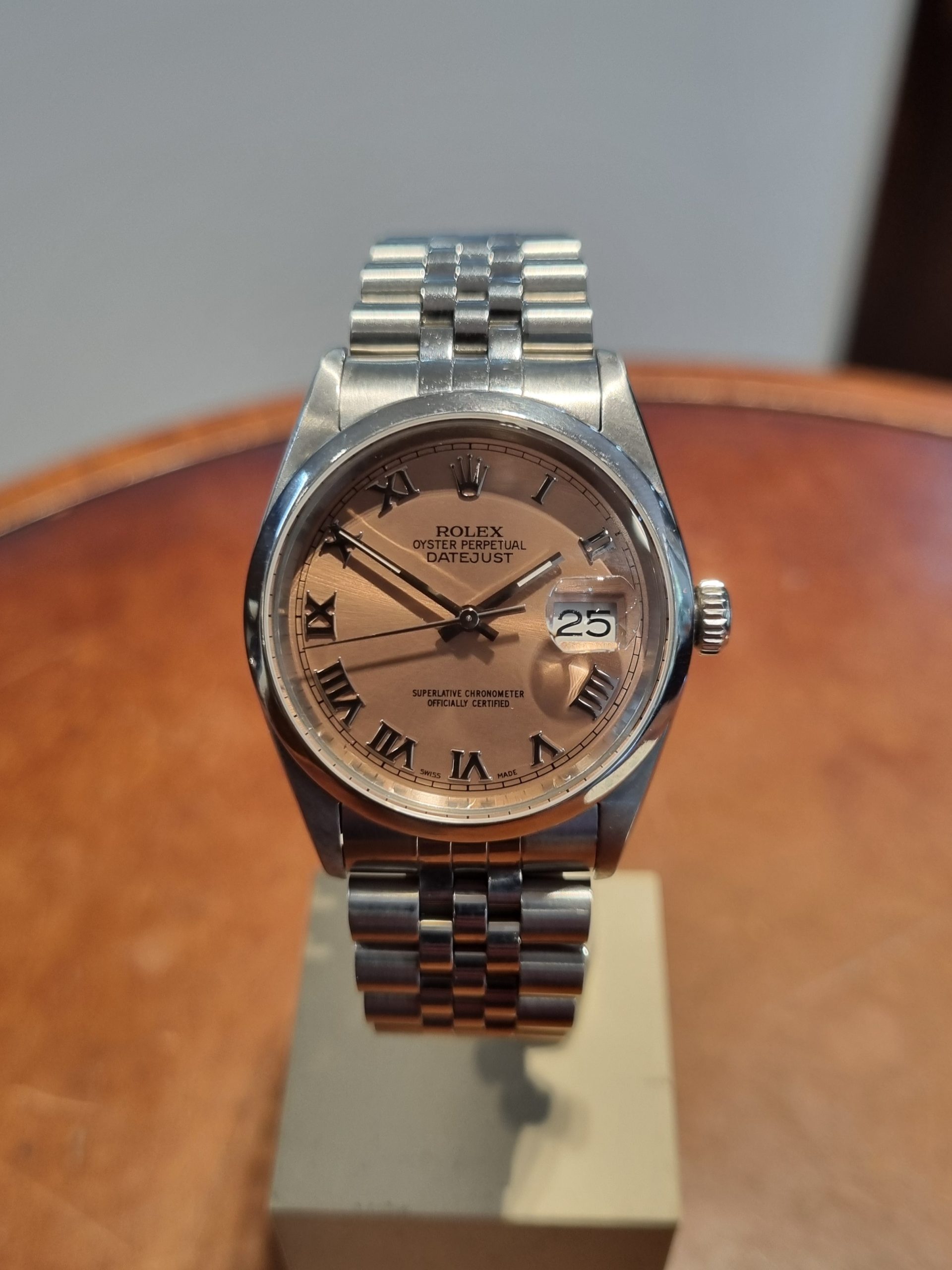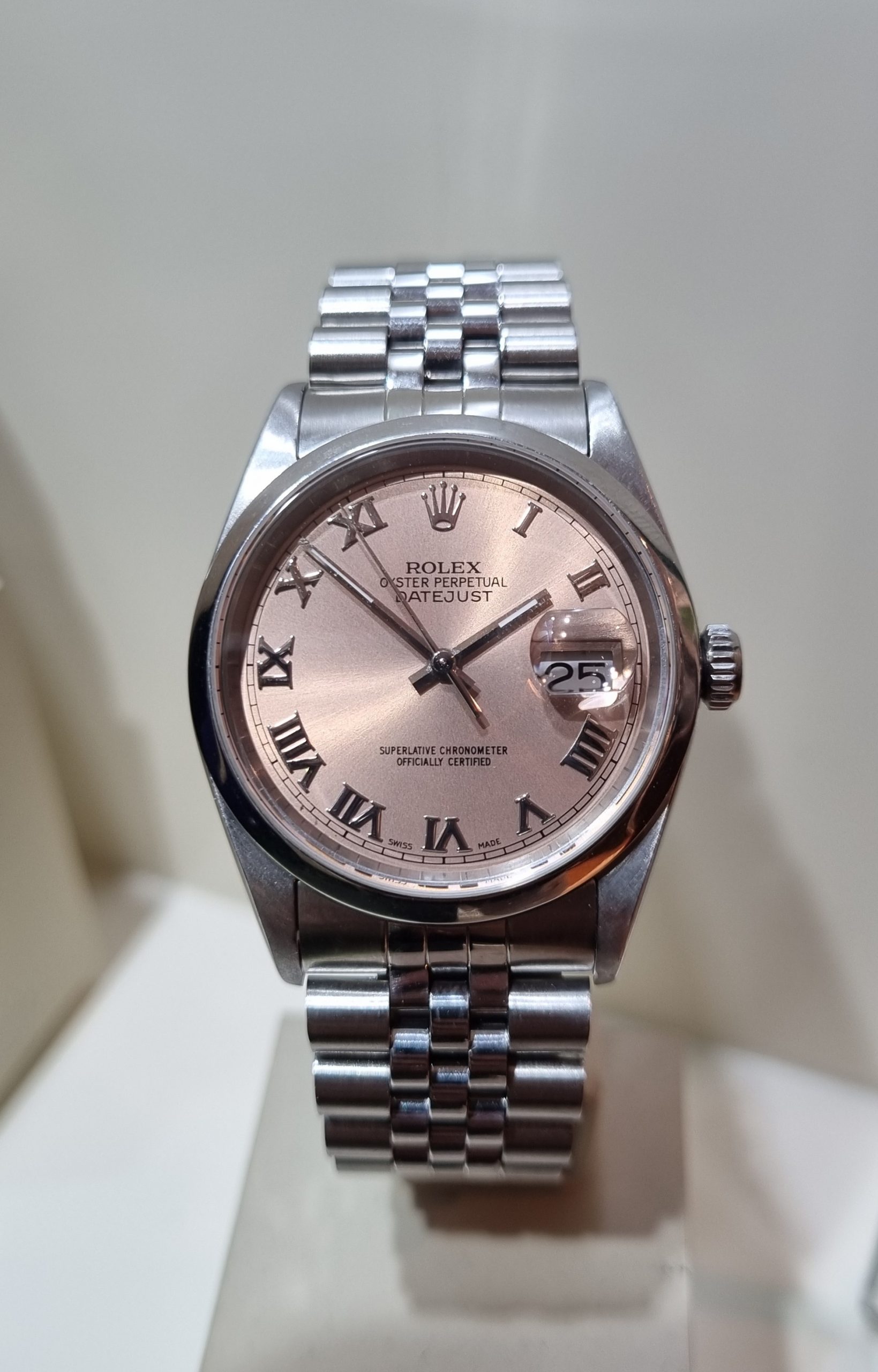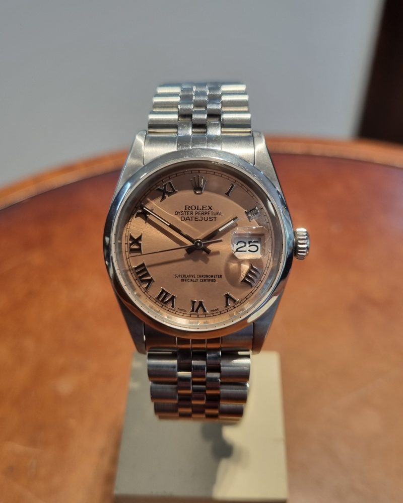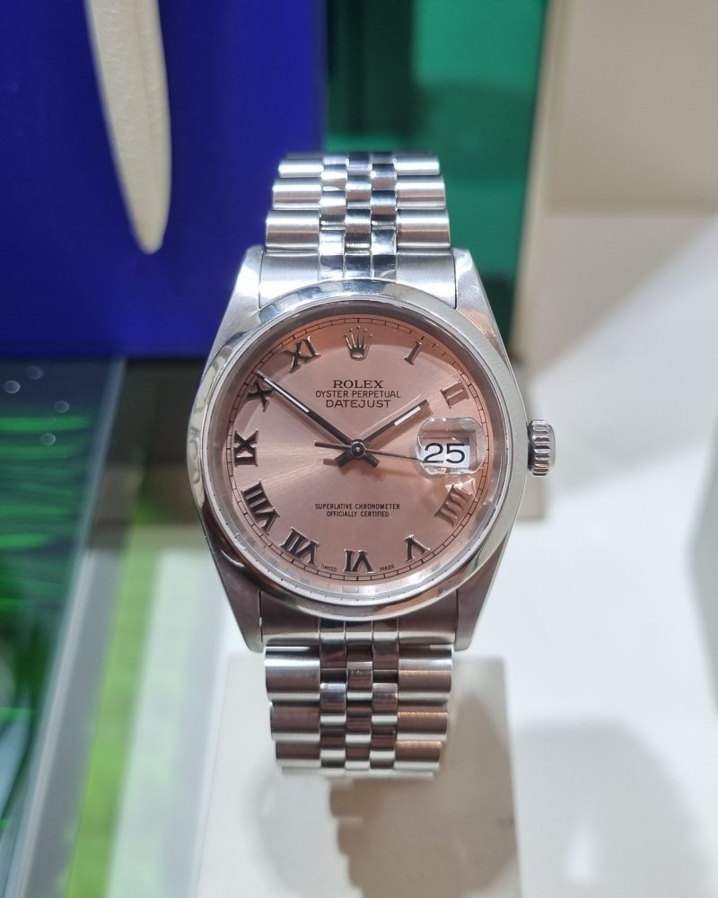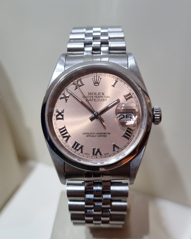 רולקס דייטג'אסט 36ממ לוח ורוד ספרות רומיות צמיד ג'ובילי יד שנייה-שנת 2001 דגם.16200