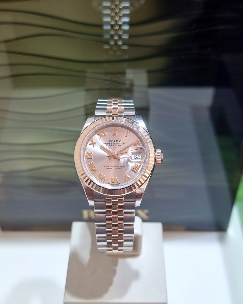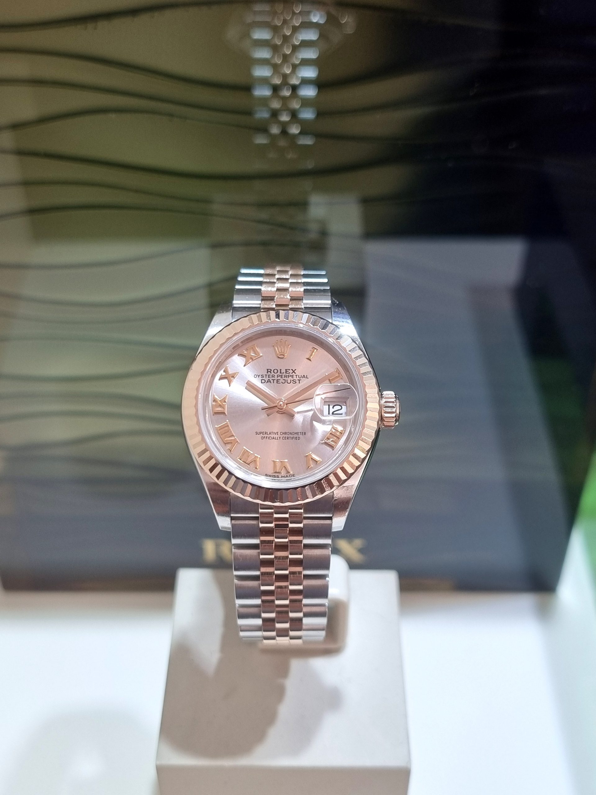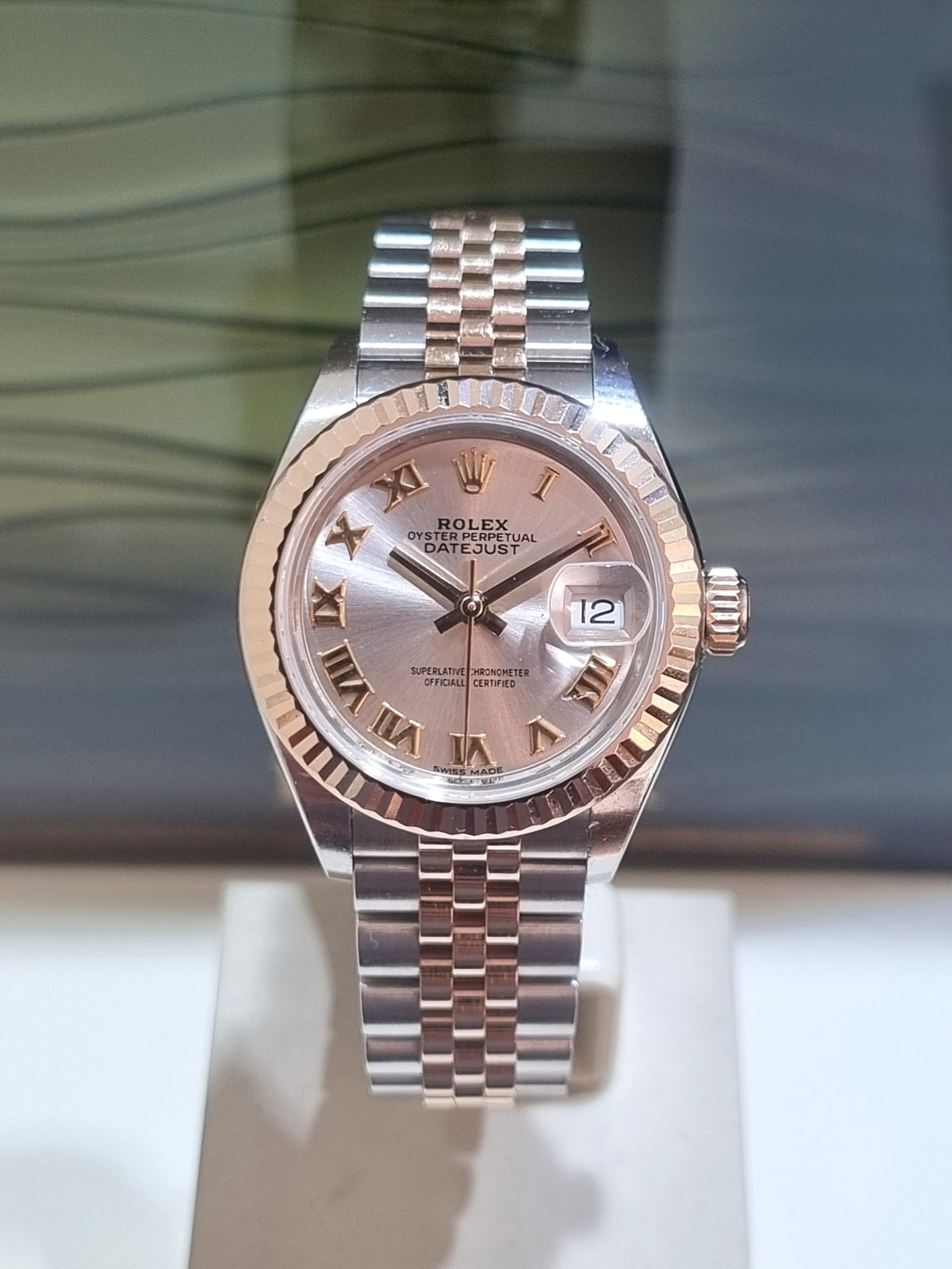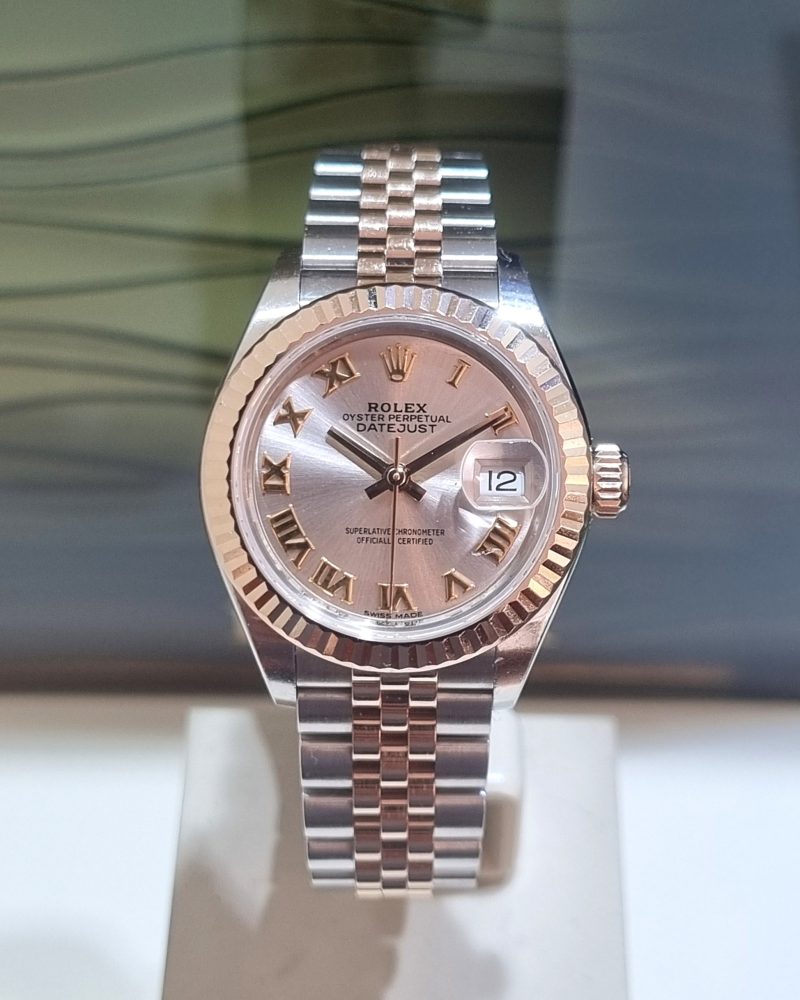 רולקס ליידי דייטג'אסט 28נשים מ"מ אויסטר פלדה עם רוז גולד דגם.279171 שנת 2021, צמיד ג'ובילי, לוח פינק ספרות רומיות, שנה אחריות