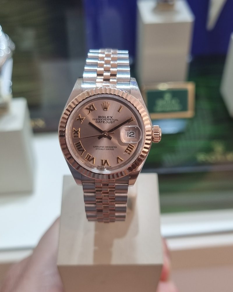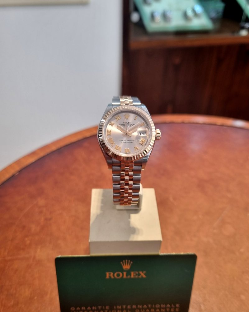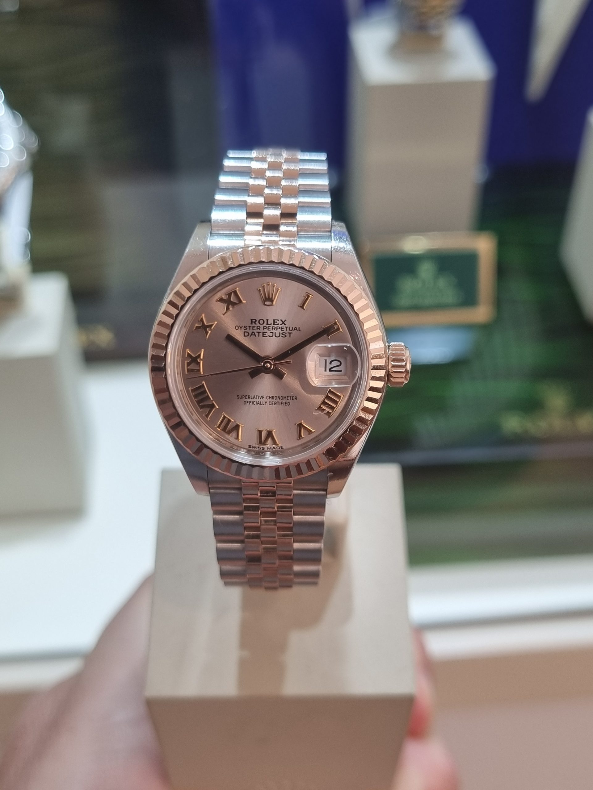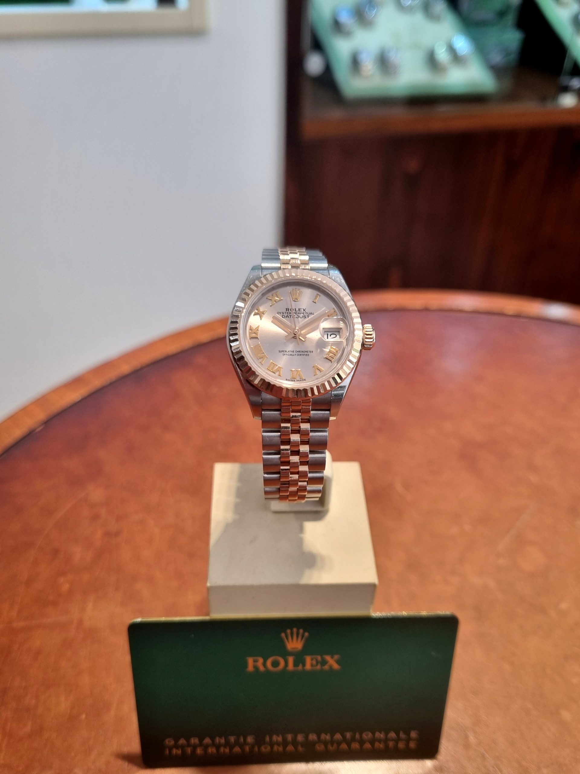 רולקס ליידי דייטג'אסט 28נשים מ"מ אויסטר פלדה עם רוז גולד דגם.279171 שנת 2021, צמיד ג'ובילי, לוח פינק ספרות רומיות, שנה אחריות