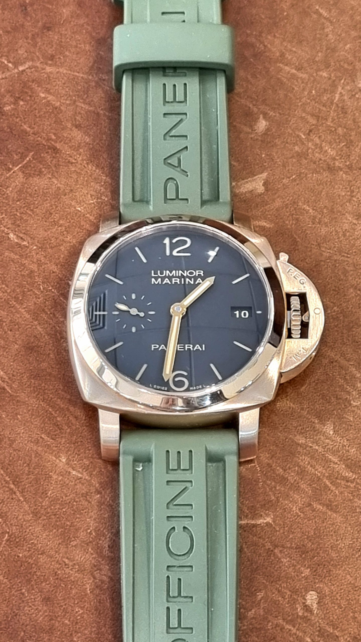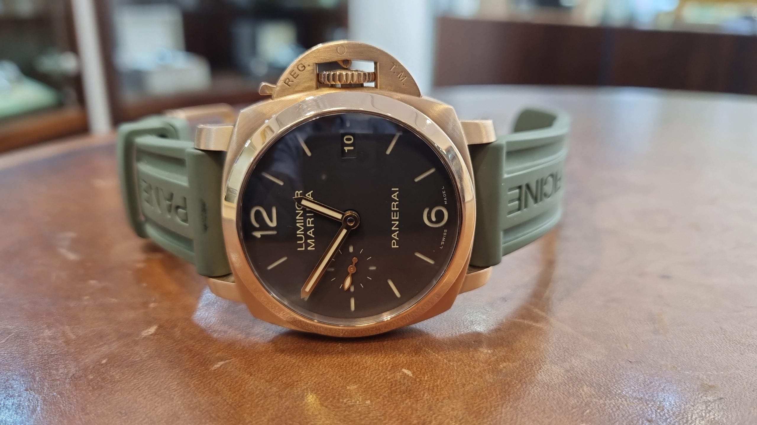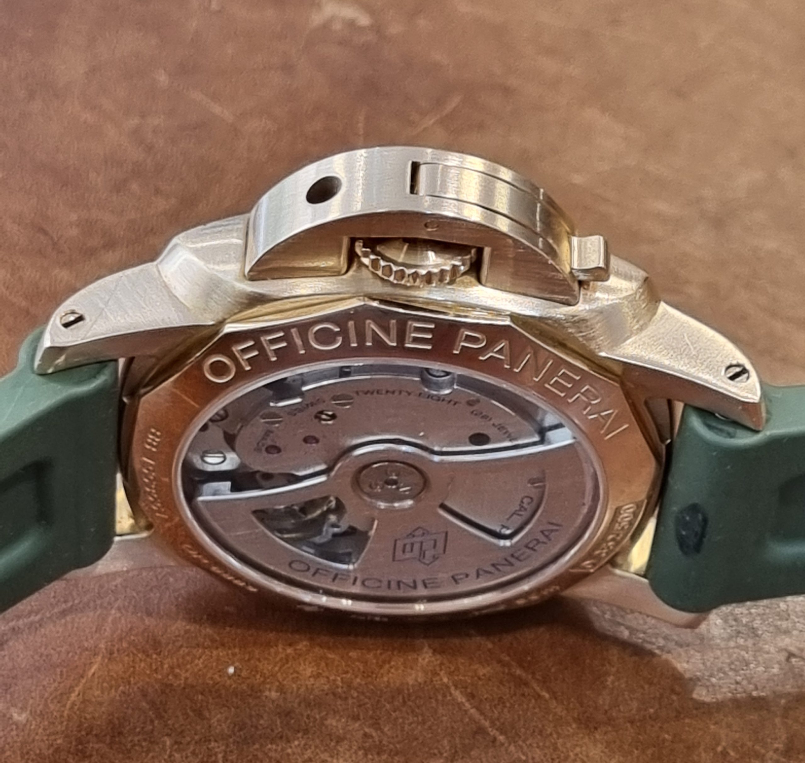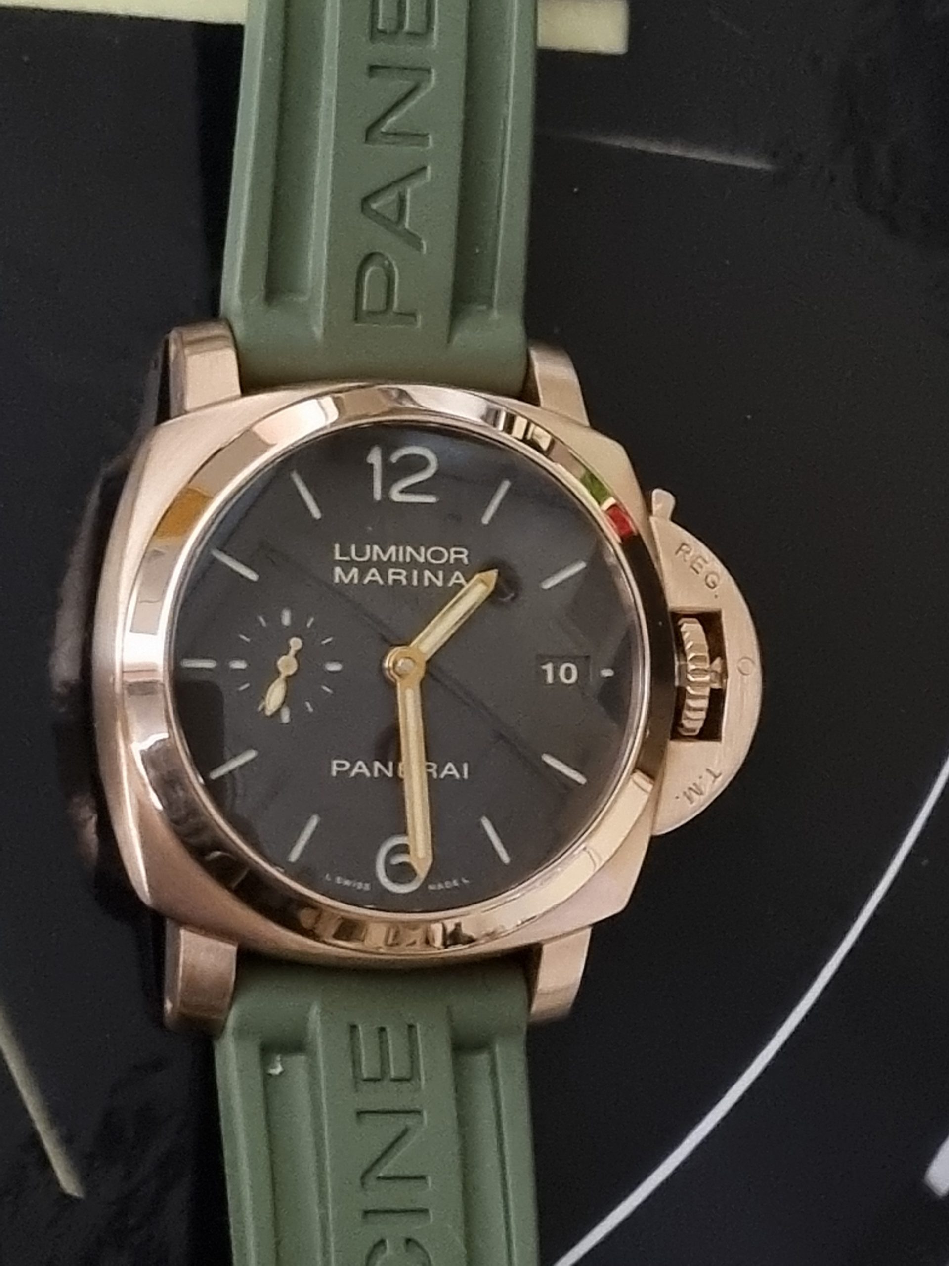פנראי לומינור מרינה 1950 3 ימים רוז גולד, קליבר P9000, אוטומטי, 42ממ על רצועת סיליקון ירוקה.