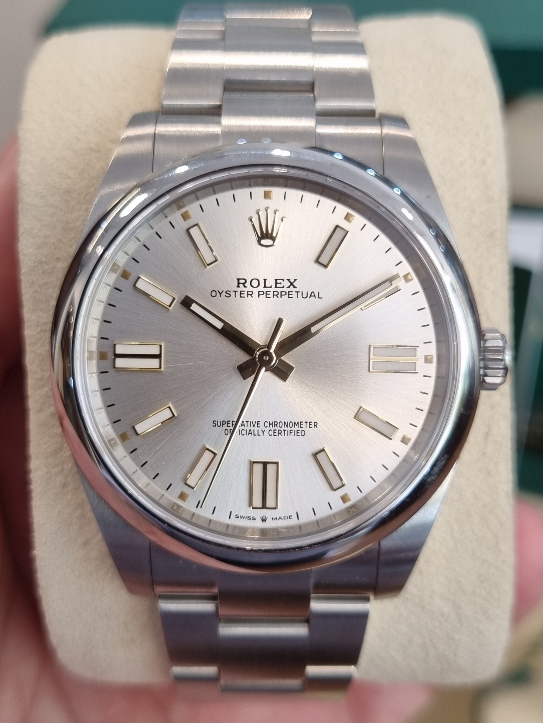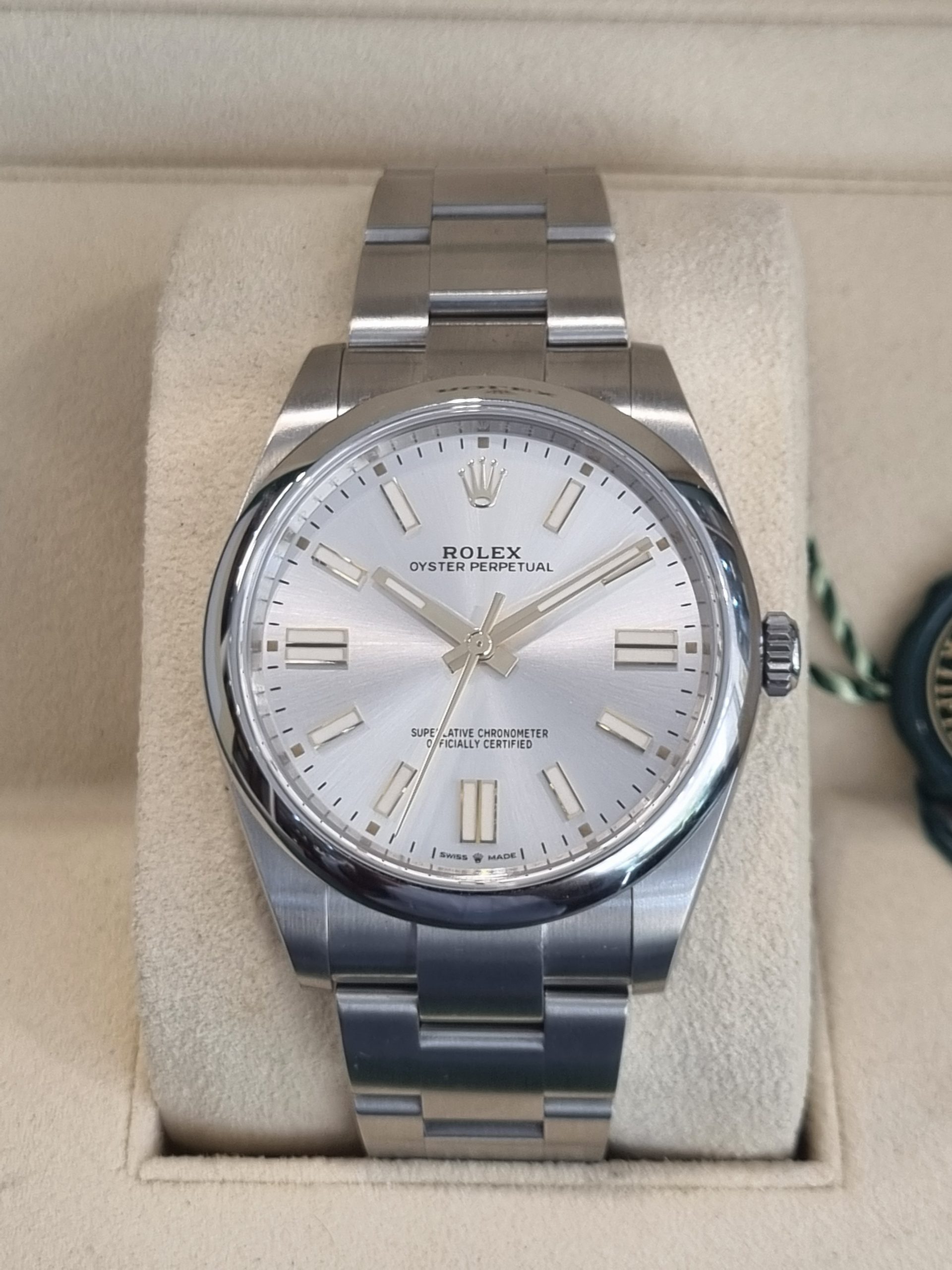 רולקס אויסטר פרפטואל 41ממ לוח מחוגים מכסף, דגם.124300 שנת 2025 חדש!! אחריות רולקס עד 2030