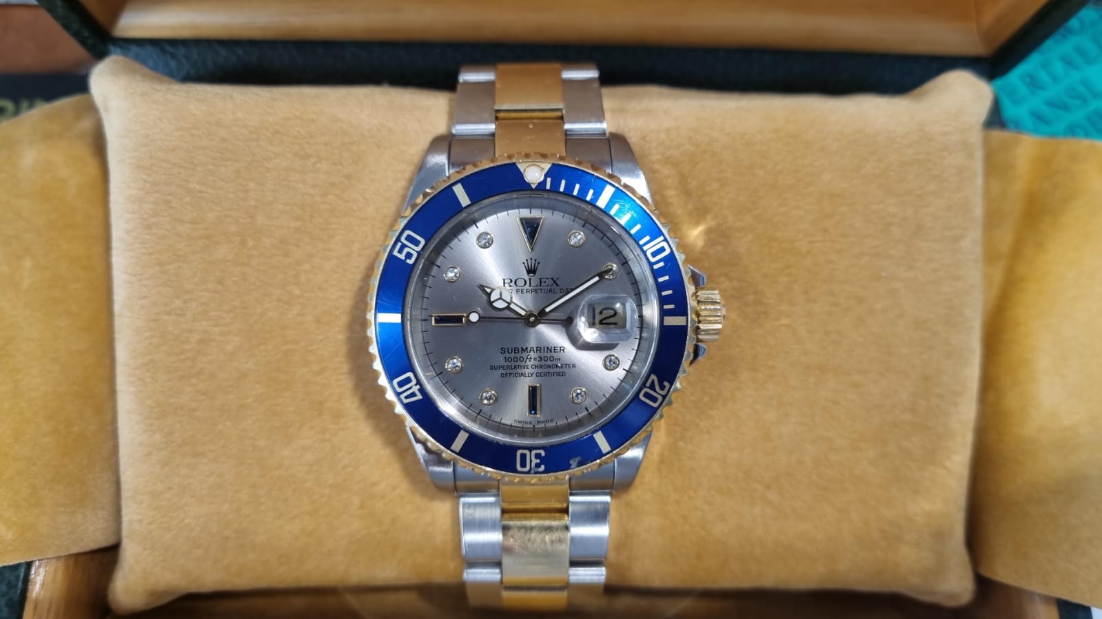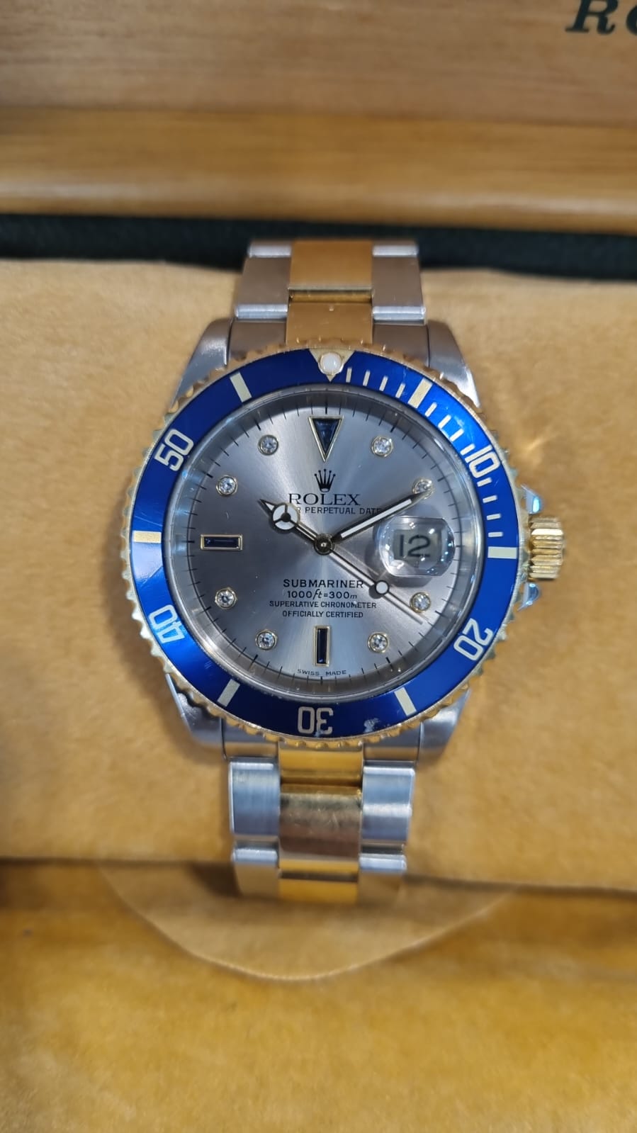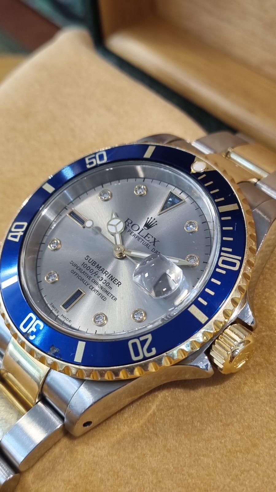רולקס סאבמרינר לוח "סרטי" אפור משובץ יהלומים, דגם., 40ממ, 16613 שנת 2002 פול סט ניירות+ספרונים+קופסא