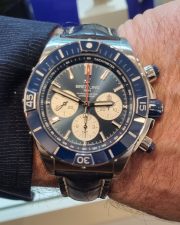 Breitling Super Chronomat B01 44 Blue Chronograph ref.AB0136, Pre-owned- 2021 full set + Steel bracelet, Breitling warranty until- 2026.