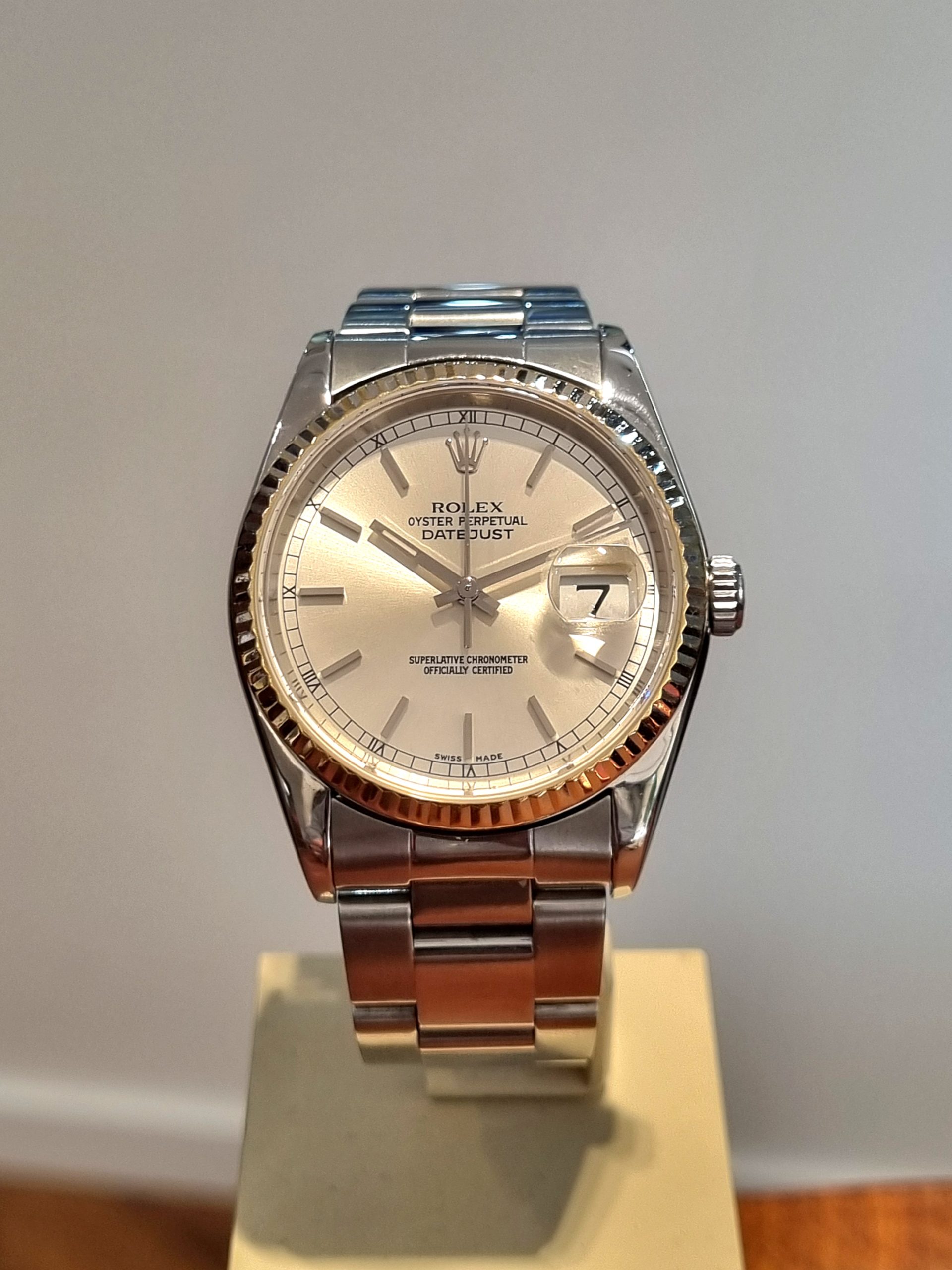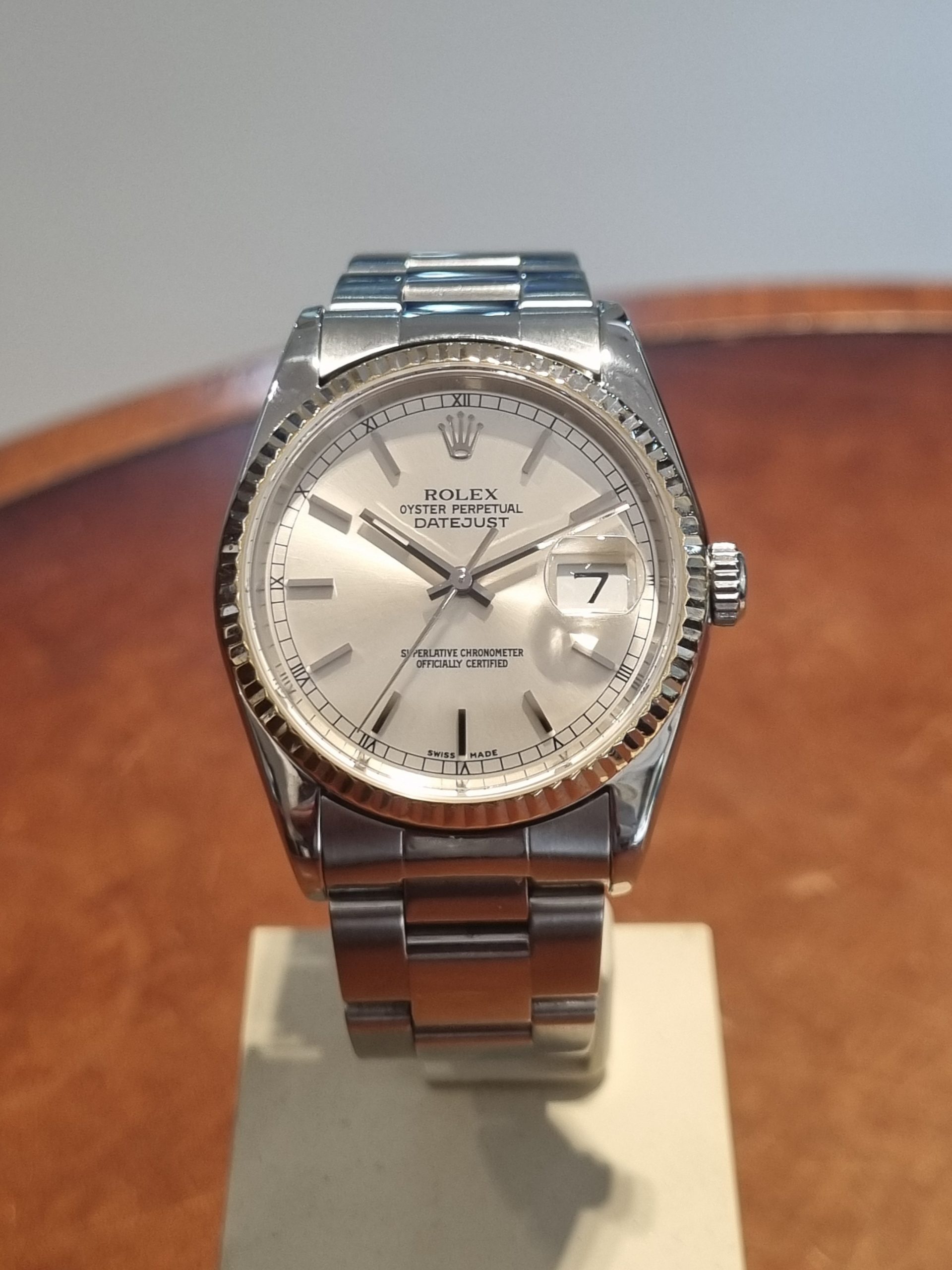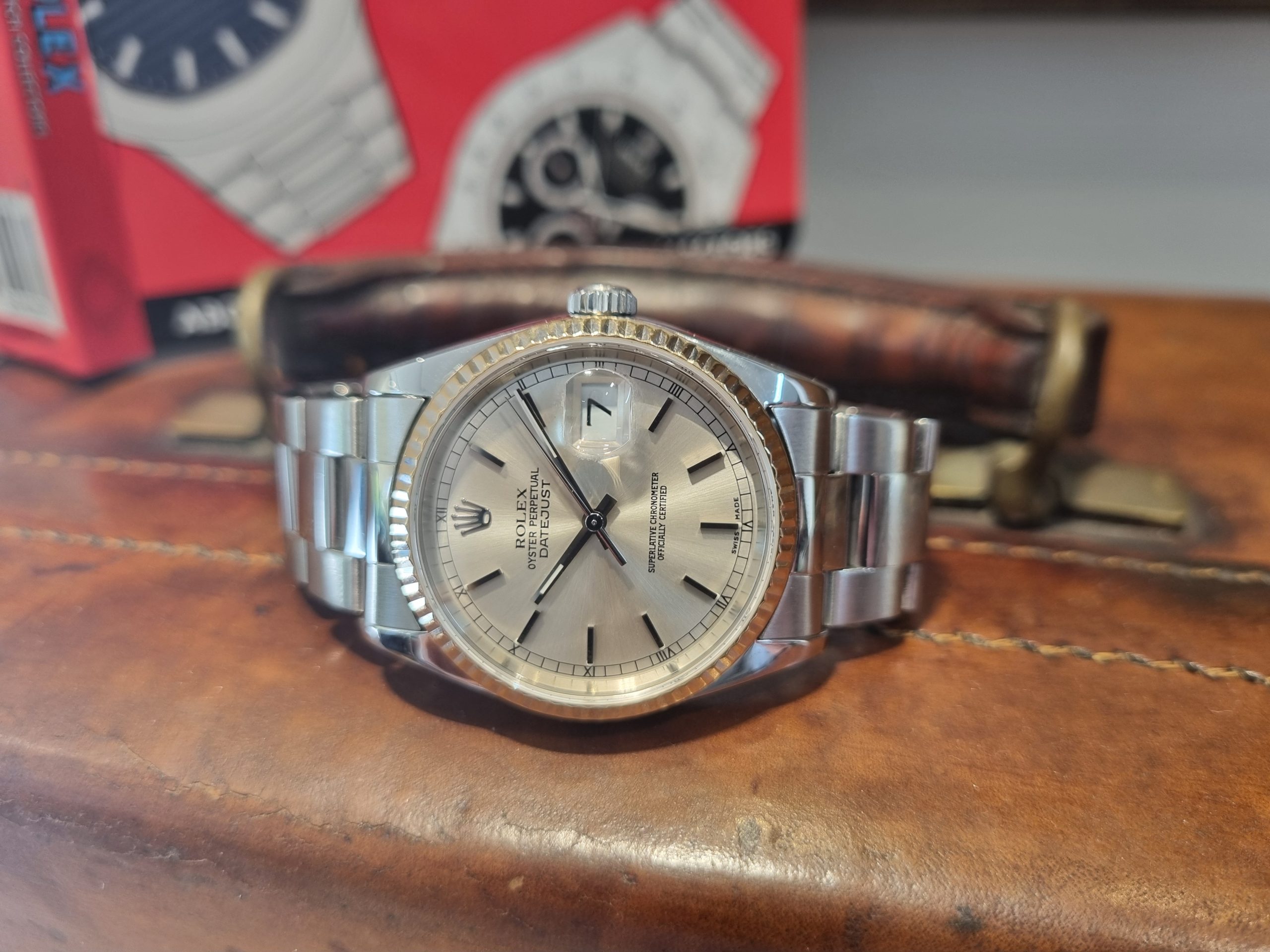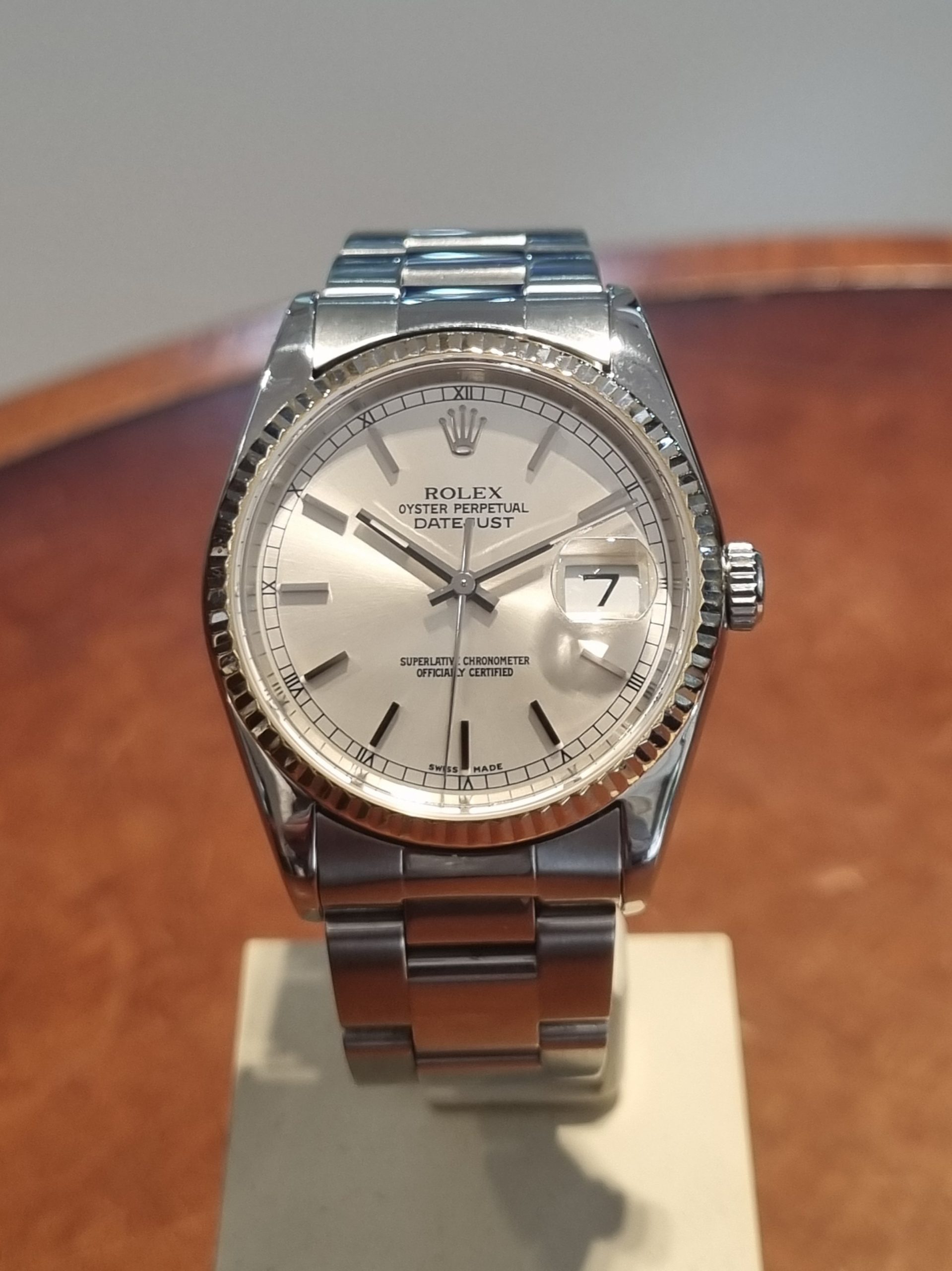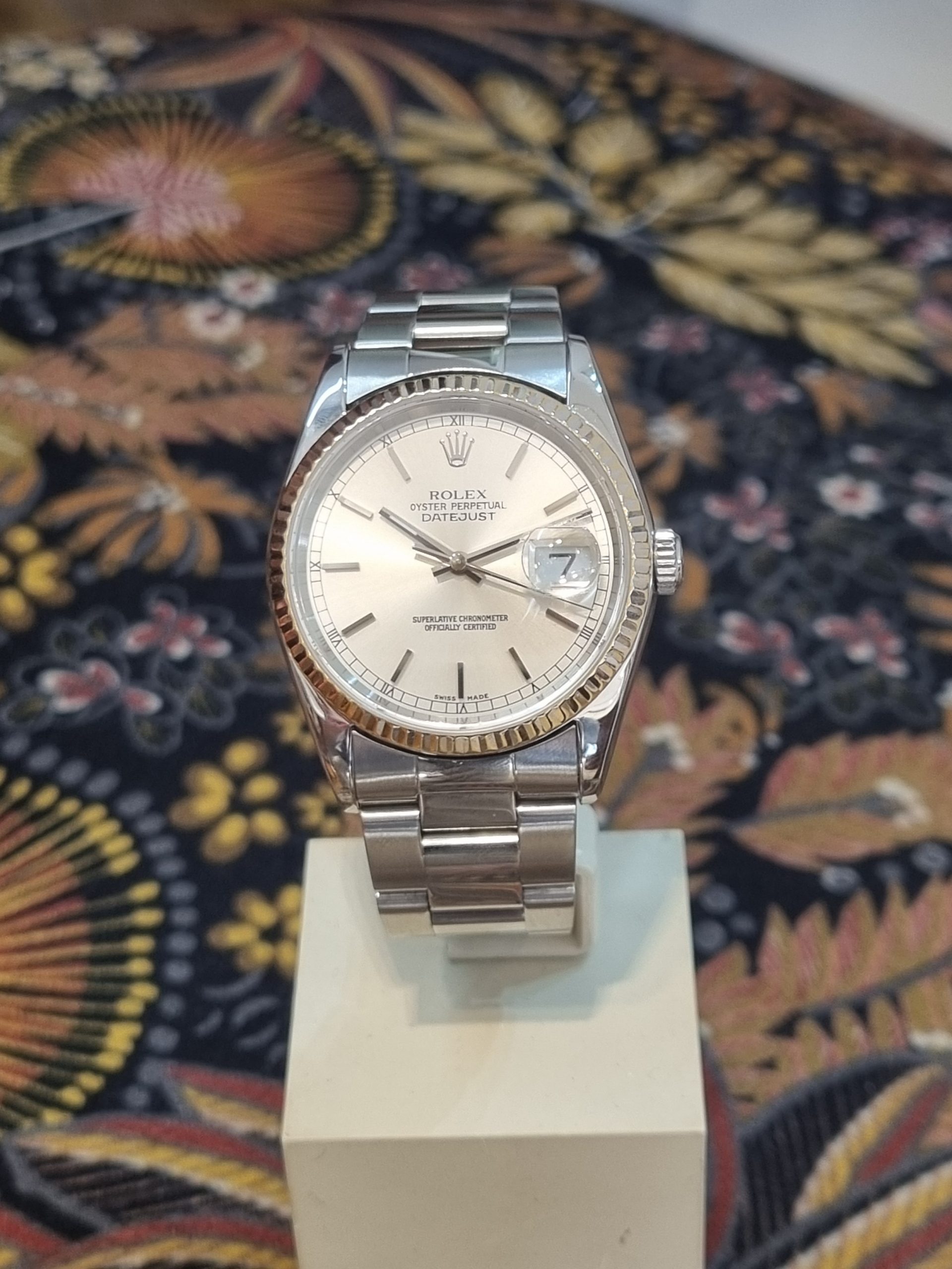 רולקס דייטג'סט 36ממ לוח סילבר כסוף באזל זהב לבן דגם.16200 שנת 2004 עם תעודות , באזל מדגם.16234 כולל באזל חלק מקורי של הדגם.