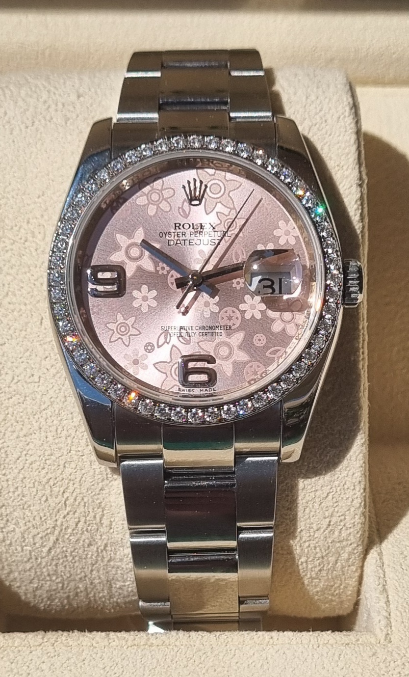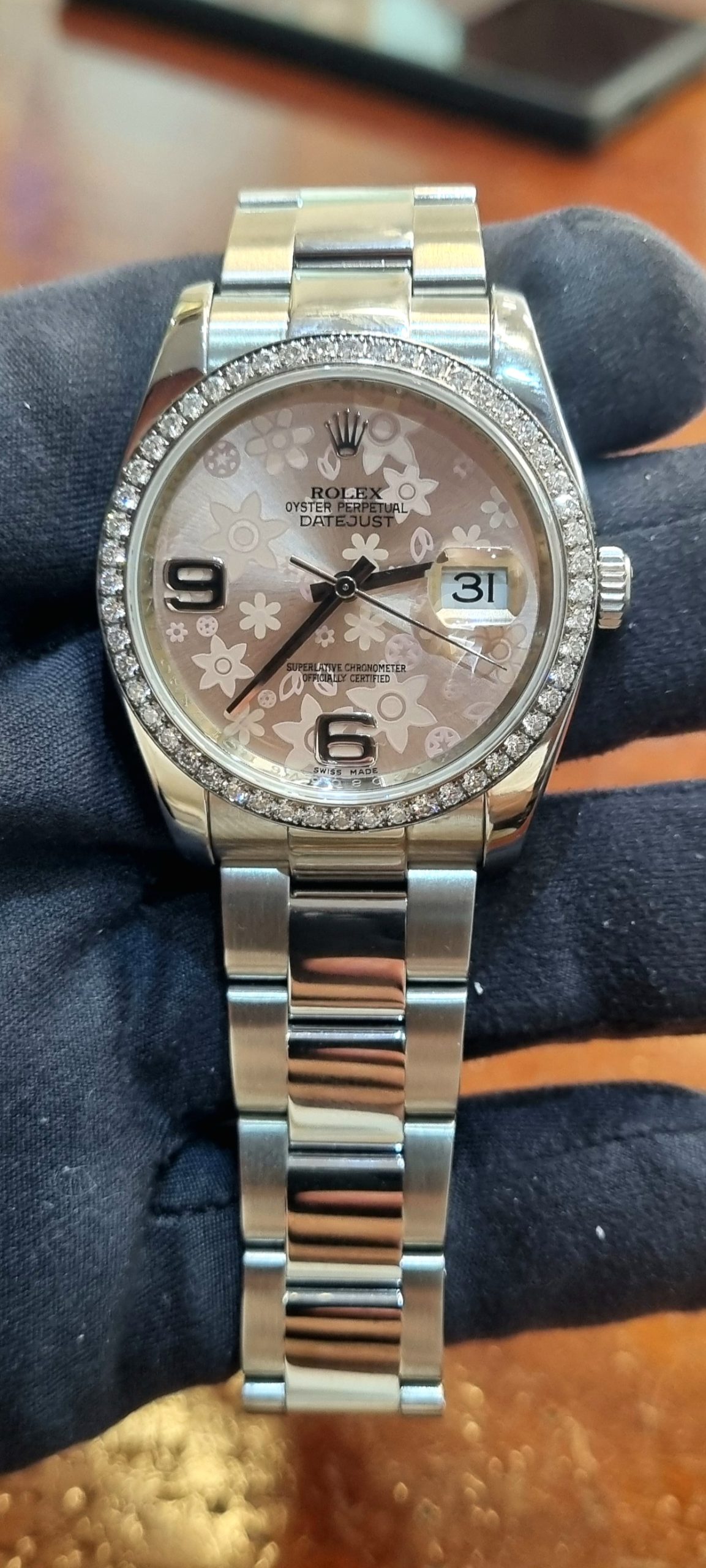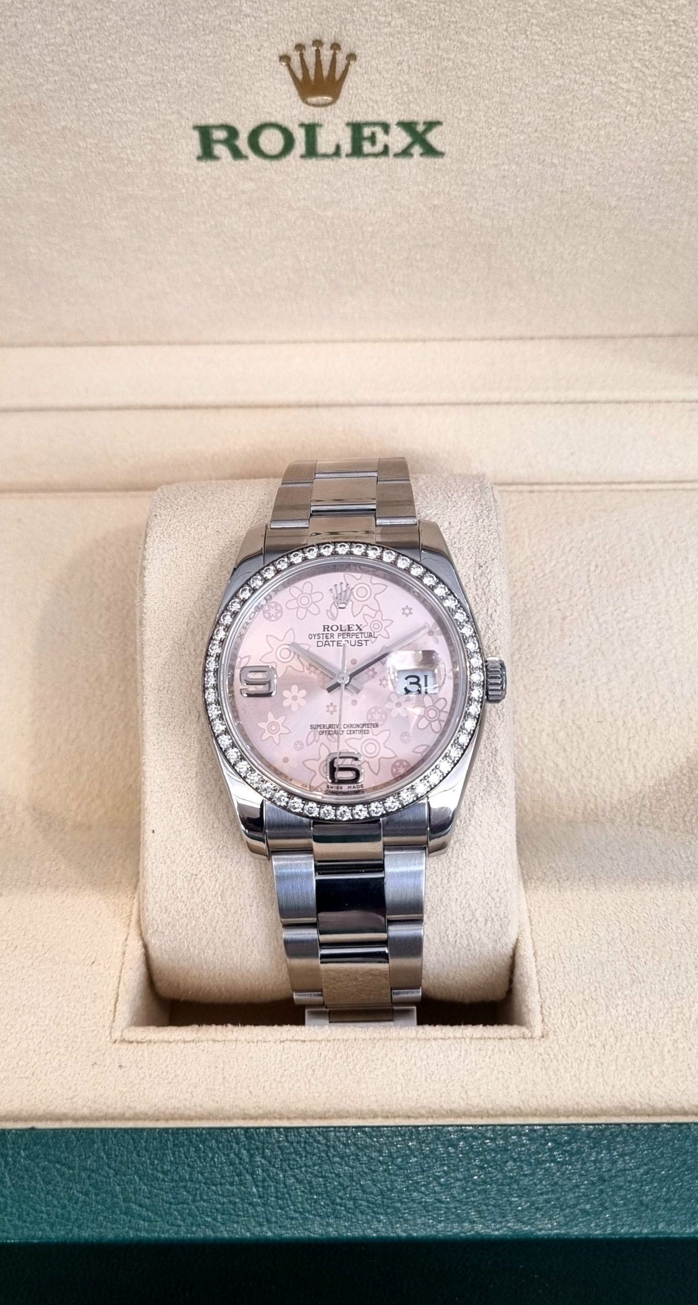 Rolex Datejust 36mm Factory Rolex Diamonds Bezel Floral Pink Dial, Pre-owned-2017, ref.116244.