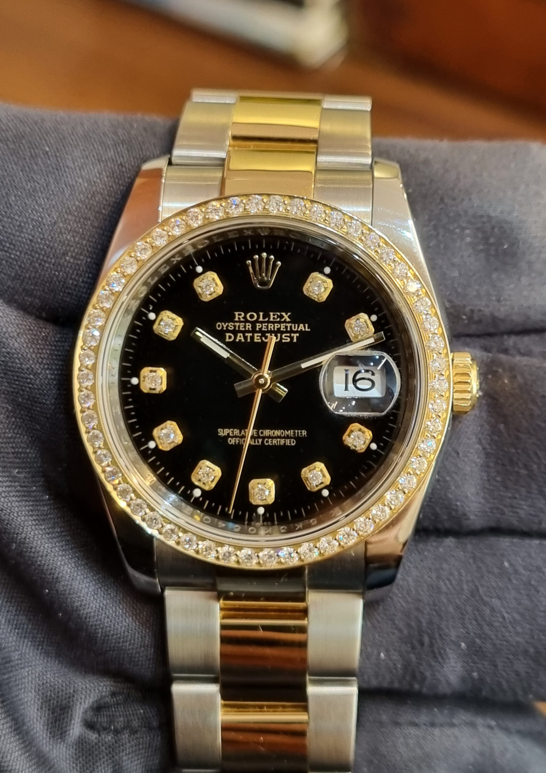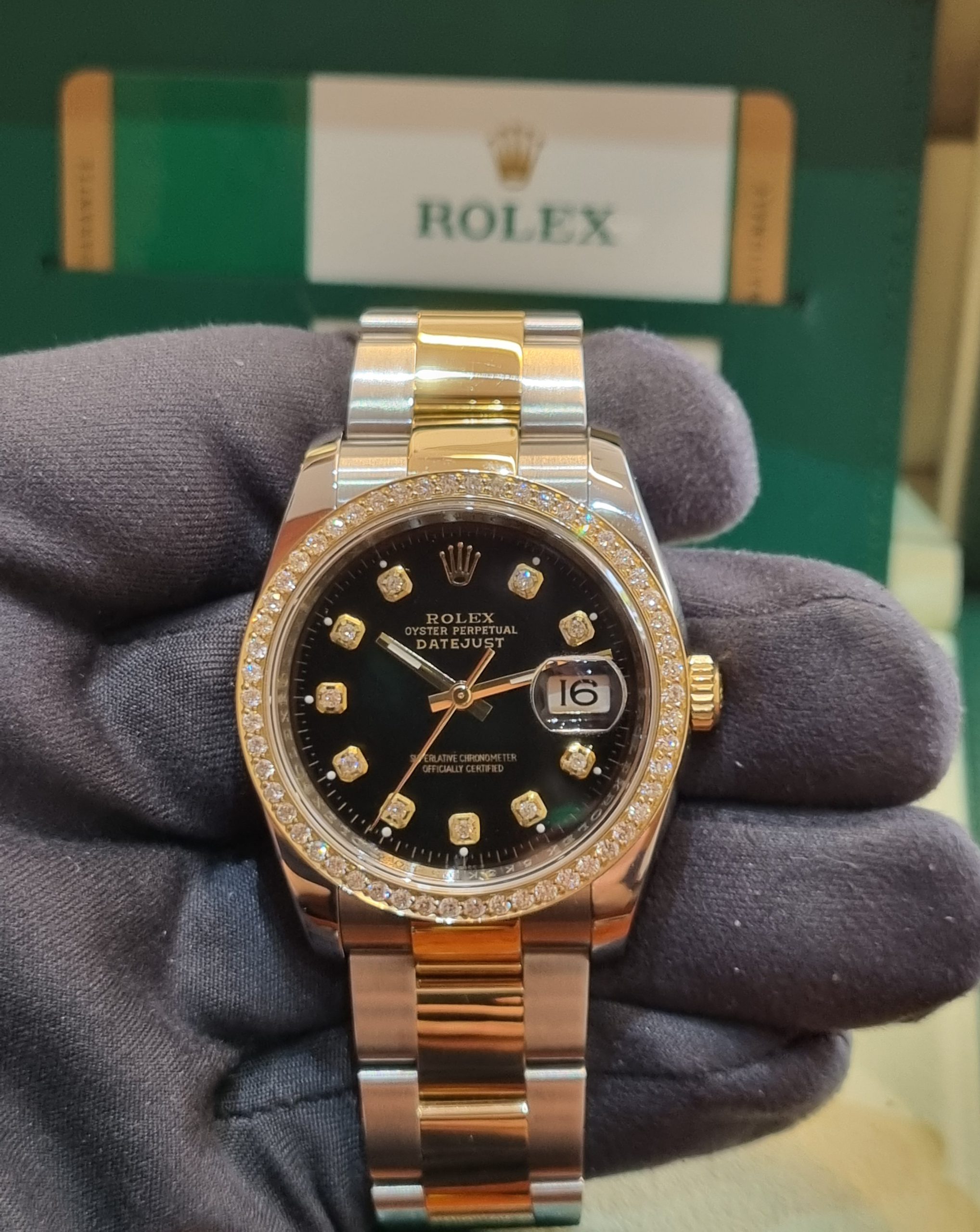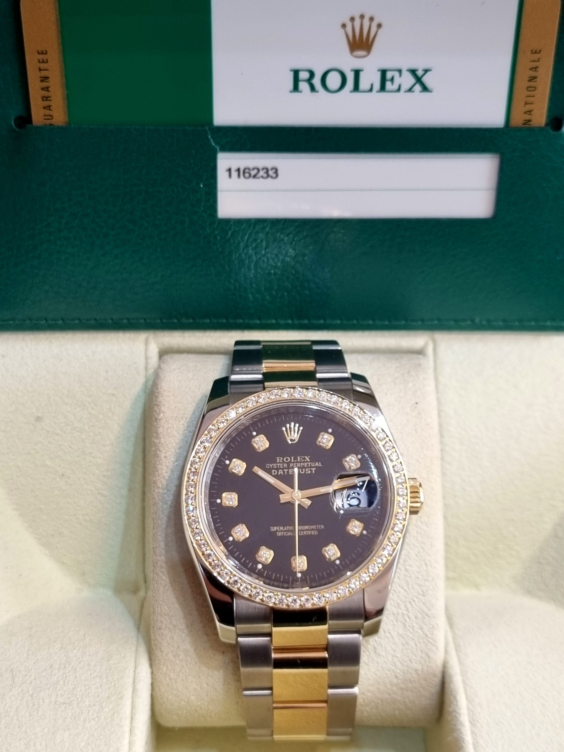 Rolex Datejust Ref.116233, Steel and Yellow Gold, 36mm, after Market Set of Black Diamonds dial+bezel from 2017.