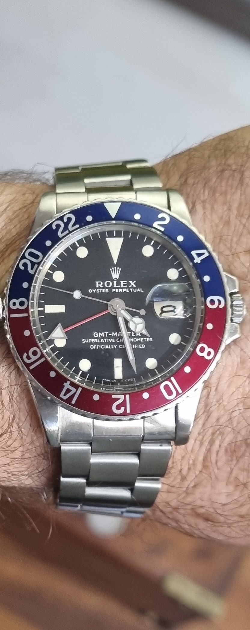 רולקס ג'י אם טי מאסטר פפסי וינטג' דגם.1675 שנת 1972 נדיר עם קופסא+ תעודה+ היסטוריה של טיפולים, מחוגים-סרוויס, שנה אחריות